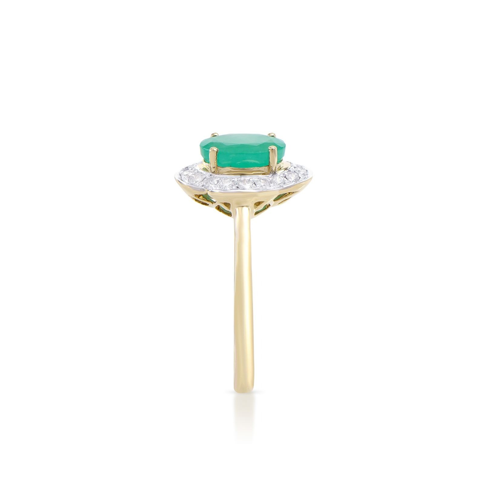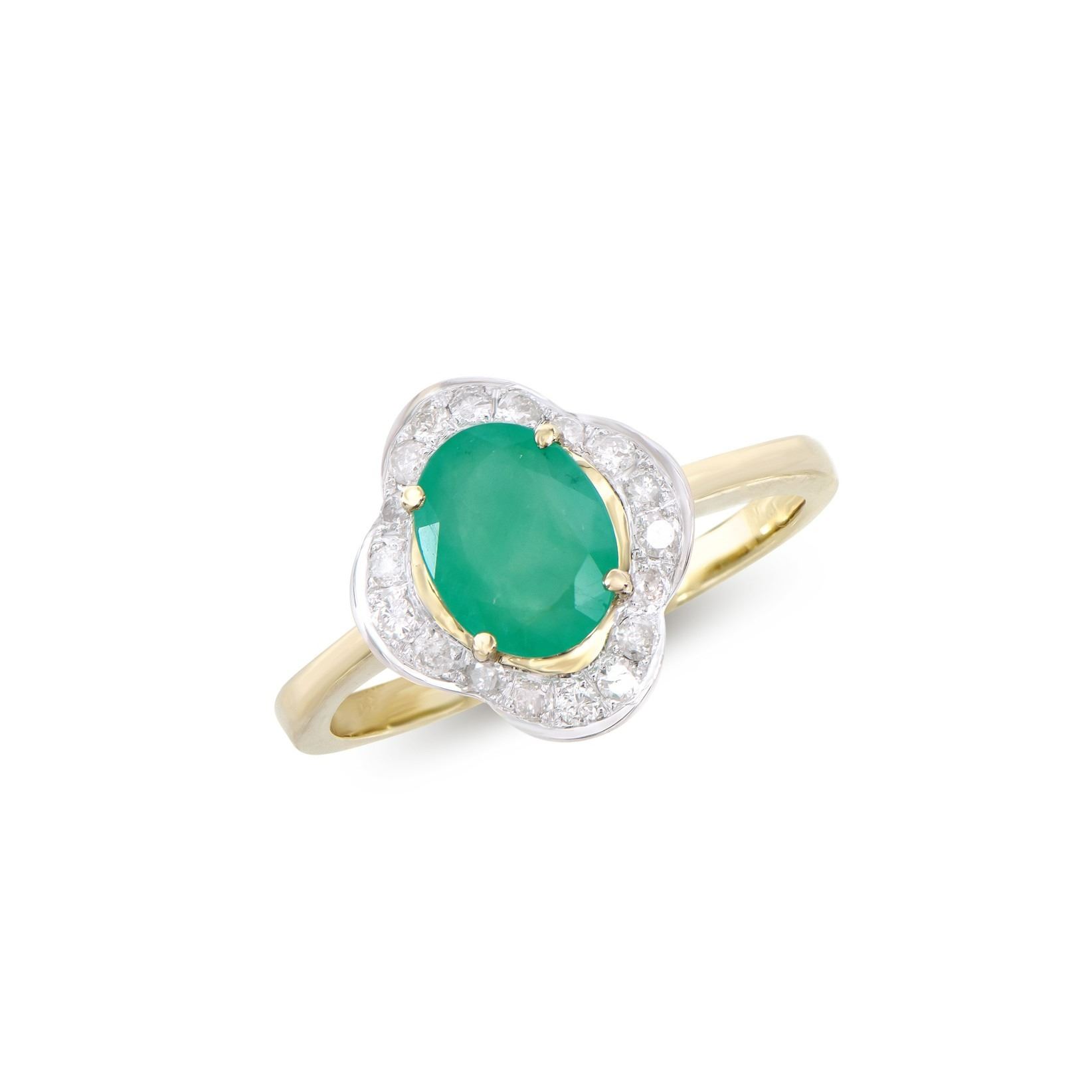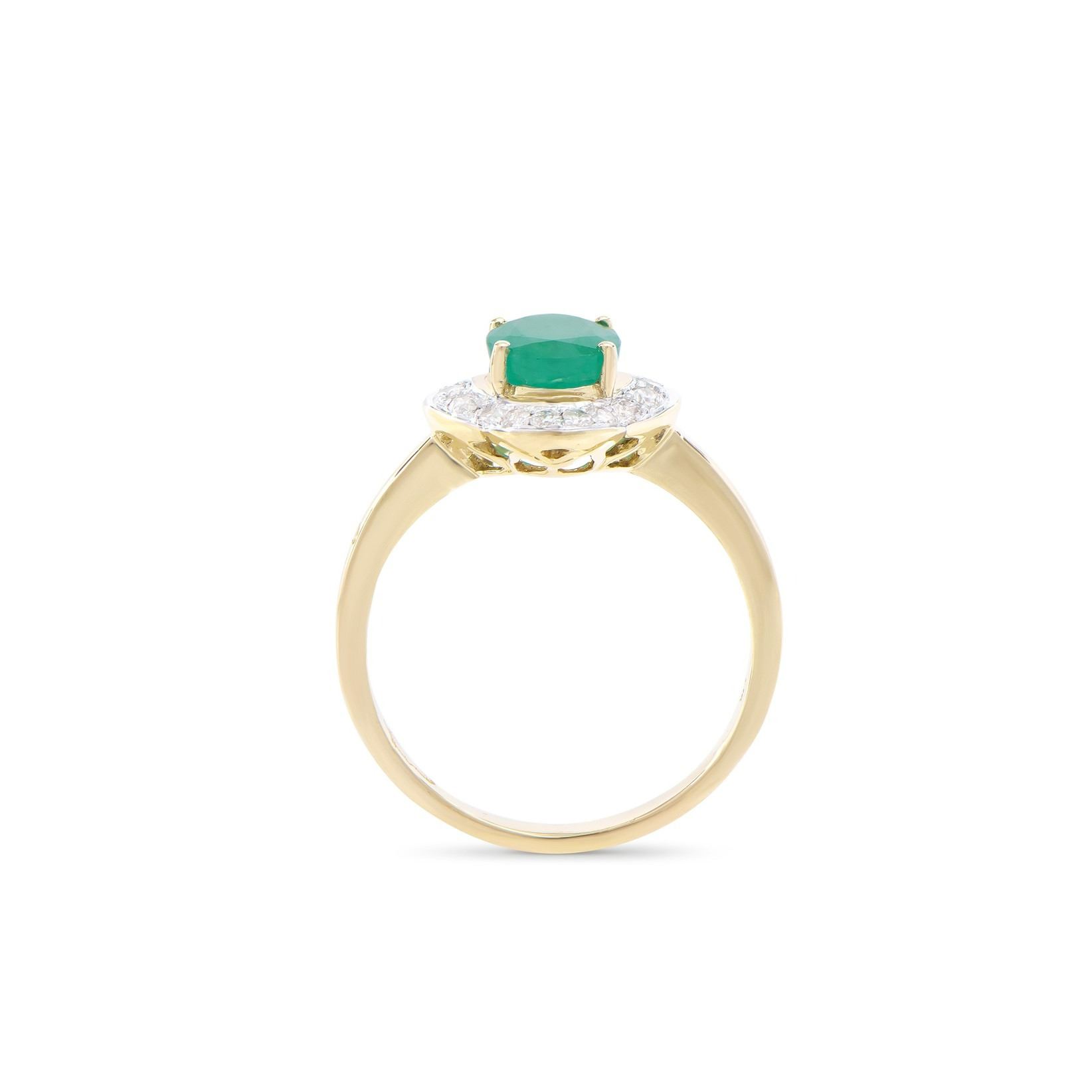 (1) Emerald with a total weight of 1.10cts. (18) round Diamonds with a total weight of 0.30cts with a color of H-I and clarity of I2-I3. Total weight of the ring is 2.60 grams. Ring size 7.5.