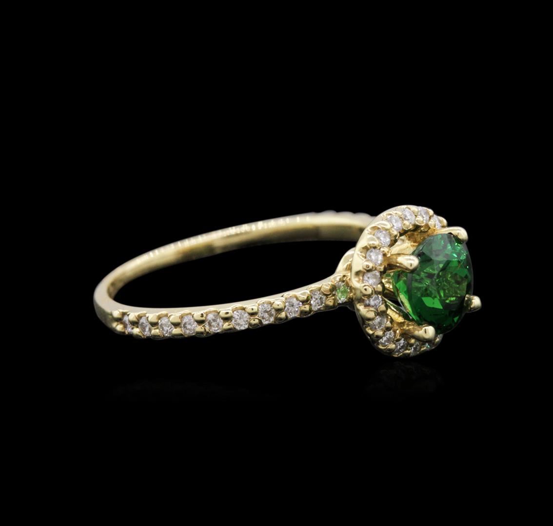 One electronically tested 14KT yellow gold ladies combination cast & assembled garnet and diamond ring with a flat shank with a bright polish finish. Identified with markings of "14K". Condition is new. Containing: One prong set round modified brilliant cut natural garnet, measuring 5.80 - 5.74 x 3.69 mm, approximate weight of 1.10ct., clarity is eye clean, medium, moderately strong, green color, (GIA G 5/4), cut is good. Thirty-Eight prong set round brilliant cut diamonds, measuring 1.30 - 1.30 x 0.78mm (depth est.) approximate total weight of 38 Stones = 0.30ct. Clarity: I-1 to I-2. Color: J - K, Cut is Good. All diamonds and colored gemstones are graded in the mounting, unless otherwise stated. Colored gemstones are presumed to have been subjected to commonly used enhancement processes. Total Weight of Colored Stones 1.10ct. Total Weight of Diamonds 0.30ct. Total Weight of Ring 2.30 grams. GGL Appraised at $2,760.00.
