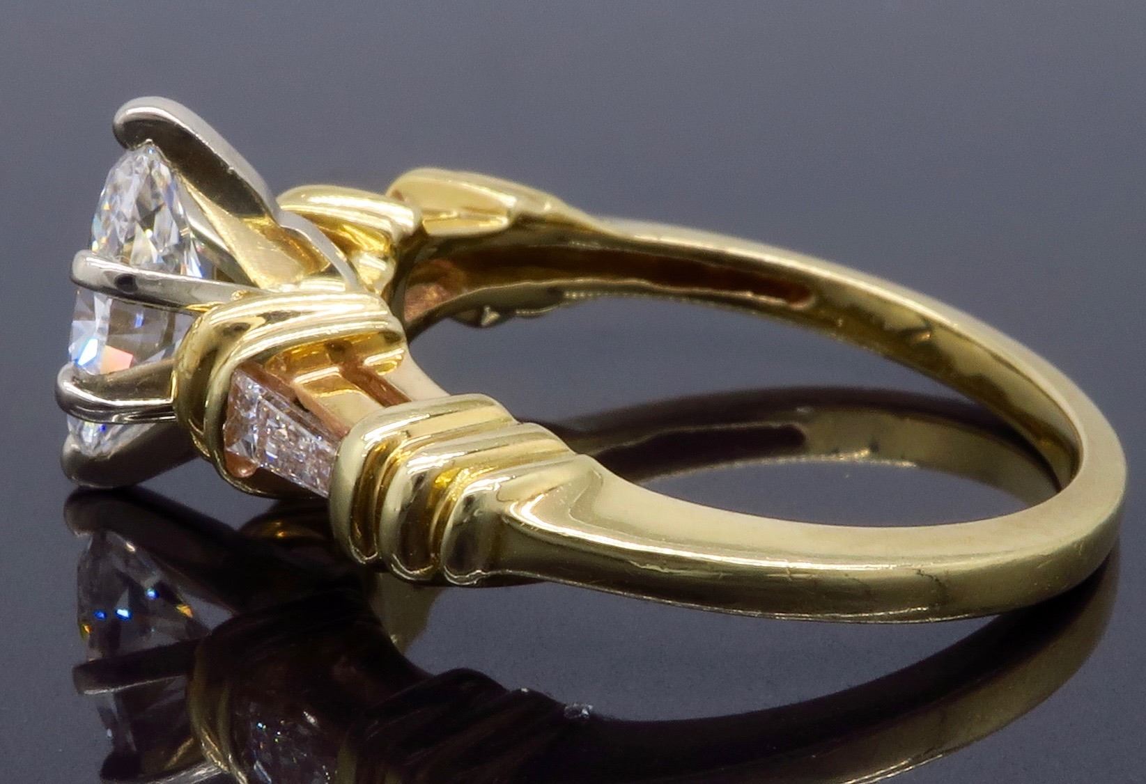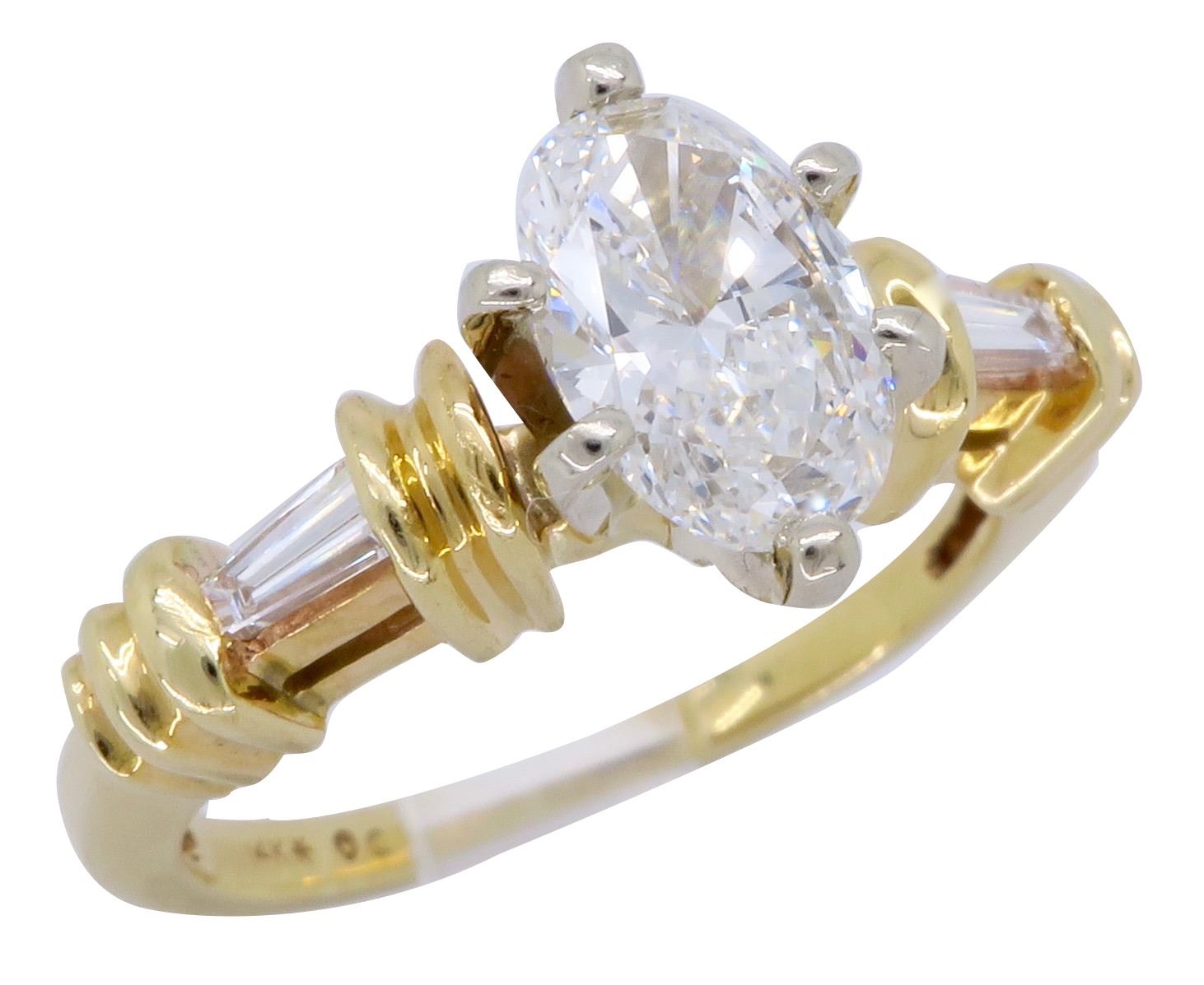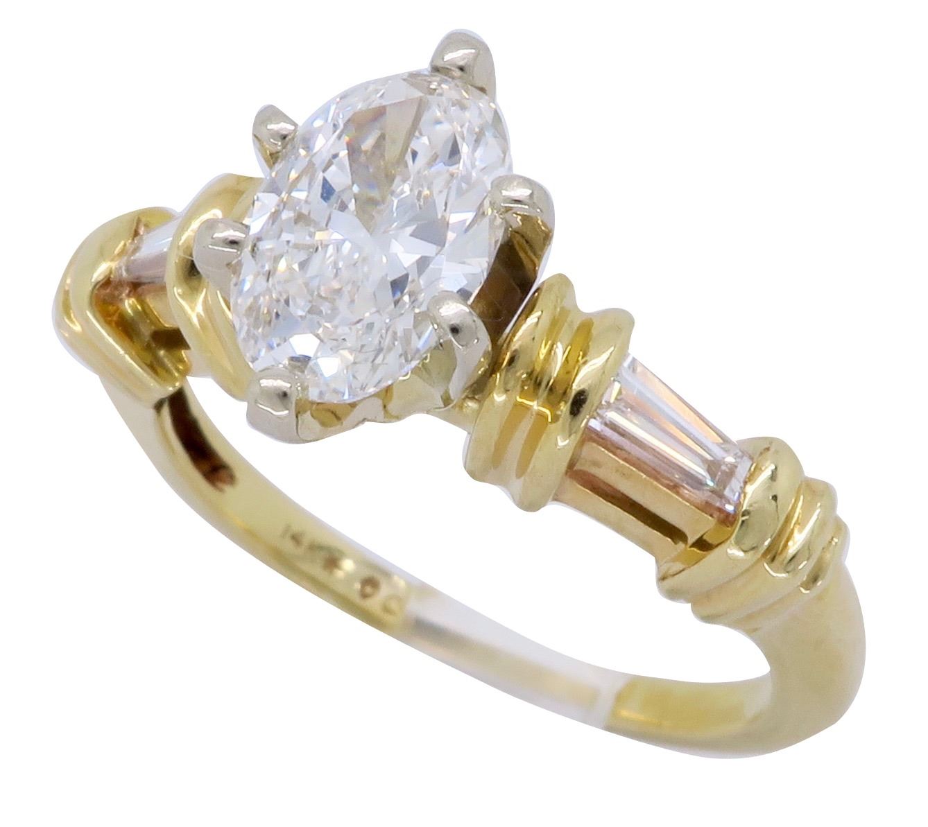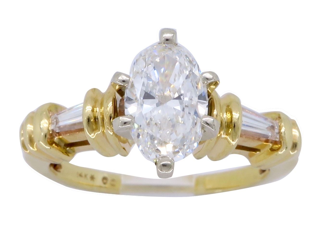 One 14KT Yellow Gold 1.11ctw GIA Cert Diamond Ring. (1) GIA Certified Oval cut Diamond with a total weight of 0.86cts with a color of F and clarity of VS-2. Side Diamonds with a total weight of 0.25cts. Total weight of this ring is 3.9 grams.