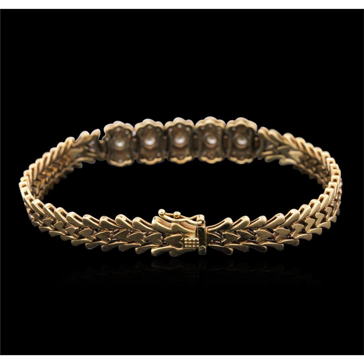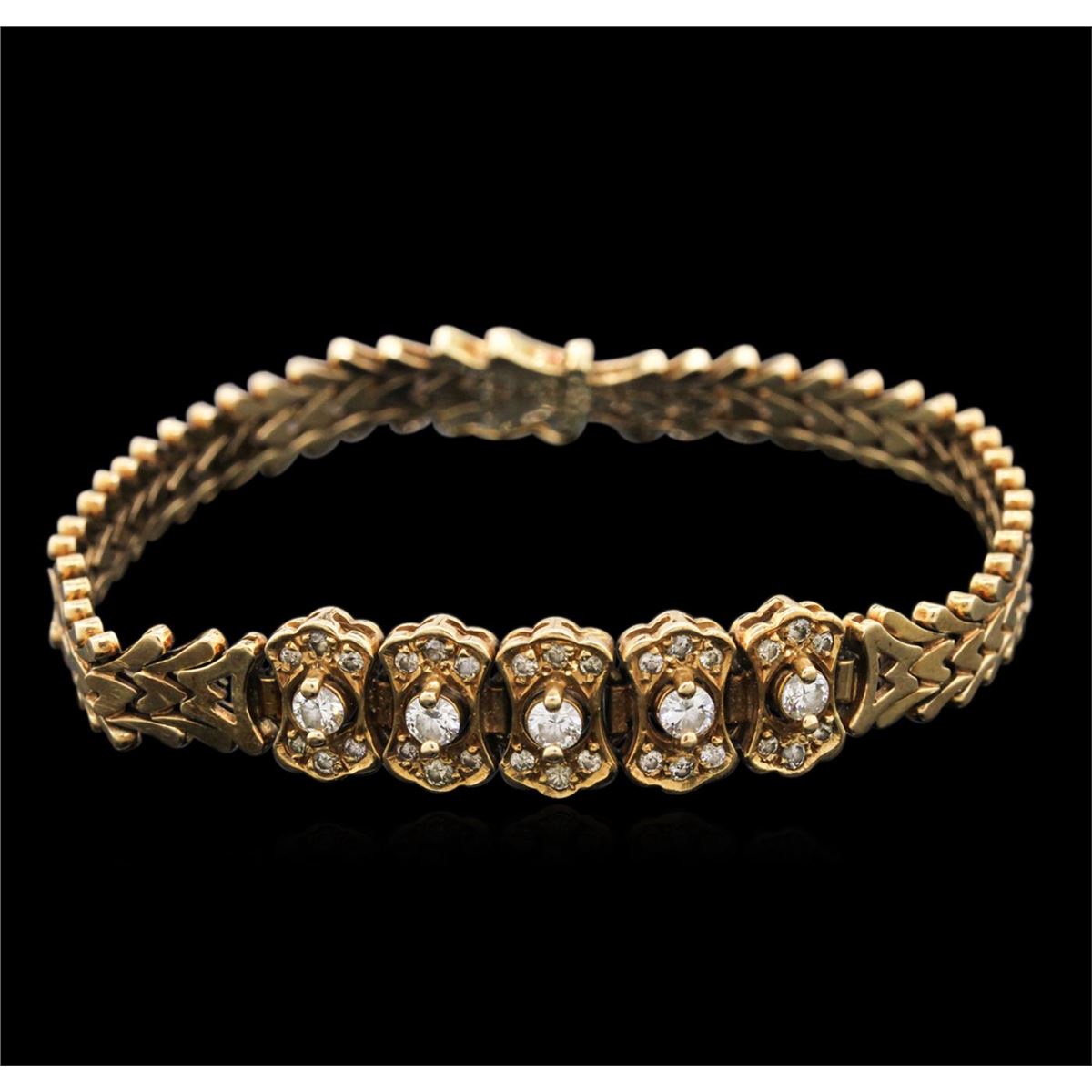 One electronically tested 14KT yellow gold ladies cast & assembled diamond bracelet with a bright polish finish. Seven and one-half inch length bracelet features five diamond set plaques supported by a flexible yellow gold ribbon, terminating in a concealed clasp with safety. Identified with markings of K14 585. Condition is good. Containing: Five prong set round brilliant cut diamonds, measuring 3.20 - 3.10 x 1.90mm (depth est.) approximate total weight of 5 Stones = 0.65ct. Graded in the setting. Clarity: VVS-1 to VVS-2 Color F - H Thirty bead set round brilliant cut diamonds, measuring 1.50 - 1.50 x 0.90mm (depth est.) approximate total weight of 30 Stones = 0.47ct. Graded in the setting. Clarity: VS-1 to SI-1. Color: G - I. Total Weight of Diamonds 1.12ct. Total Weight of Bracelet 18.49 grams. AIG Appraised at $7,435.00.