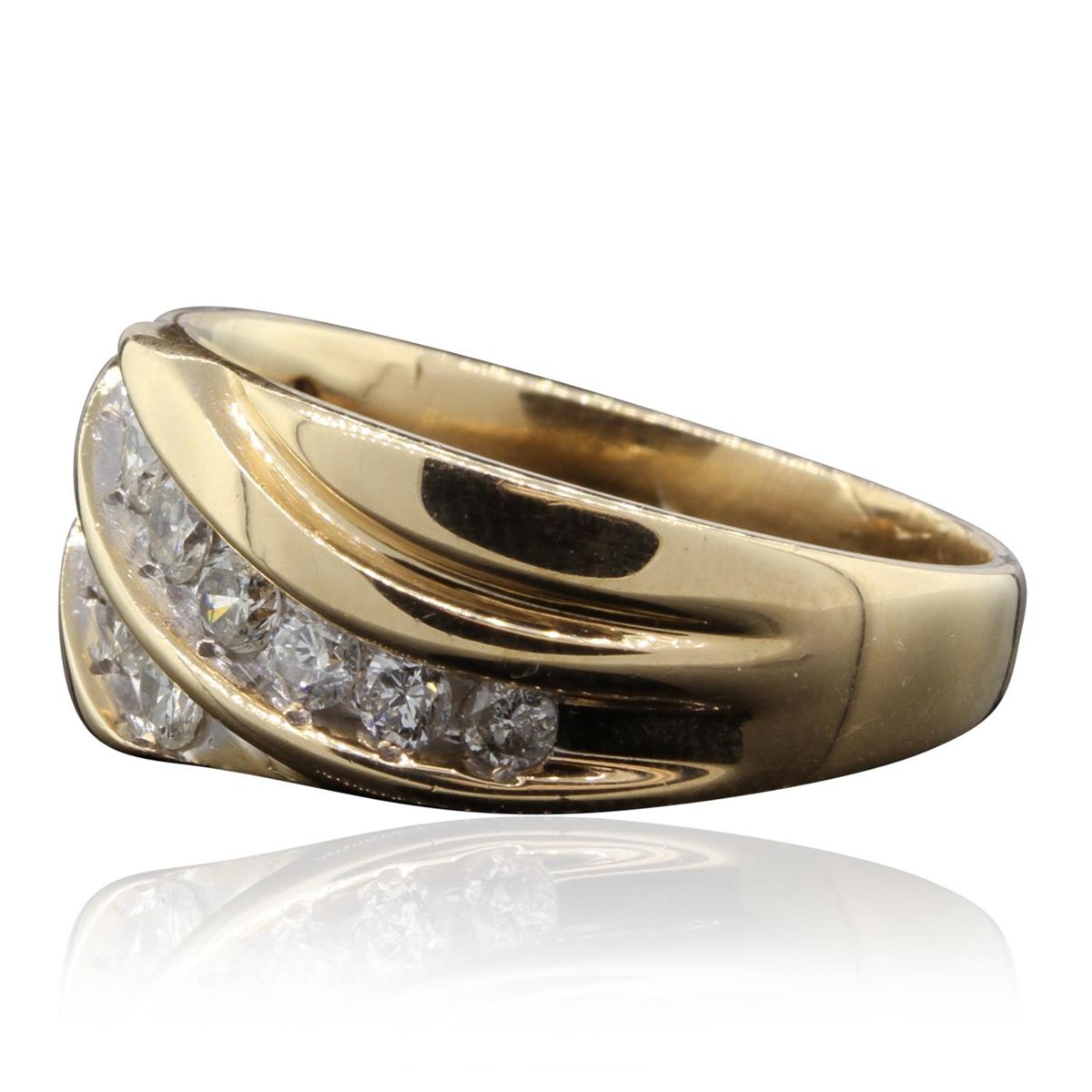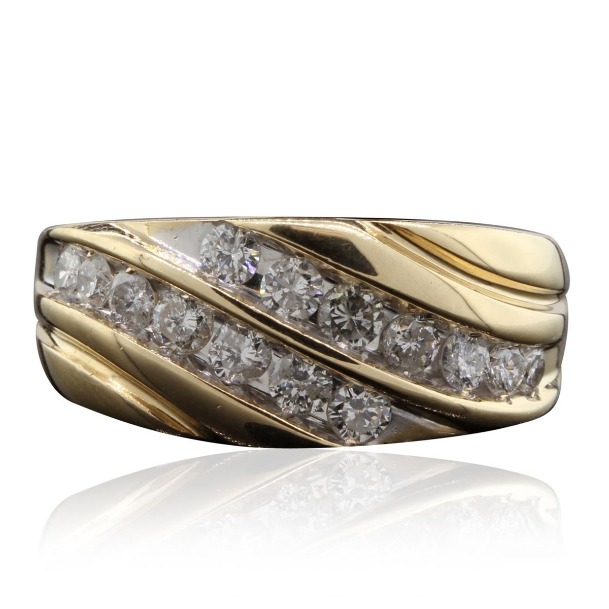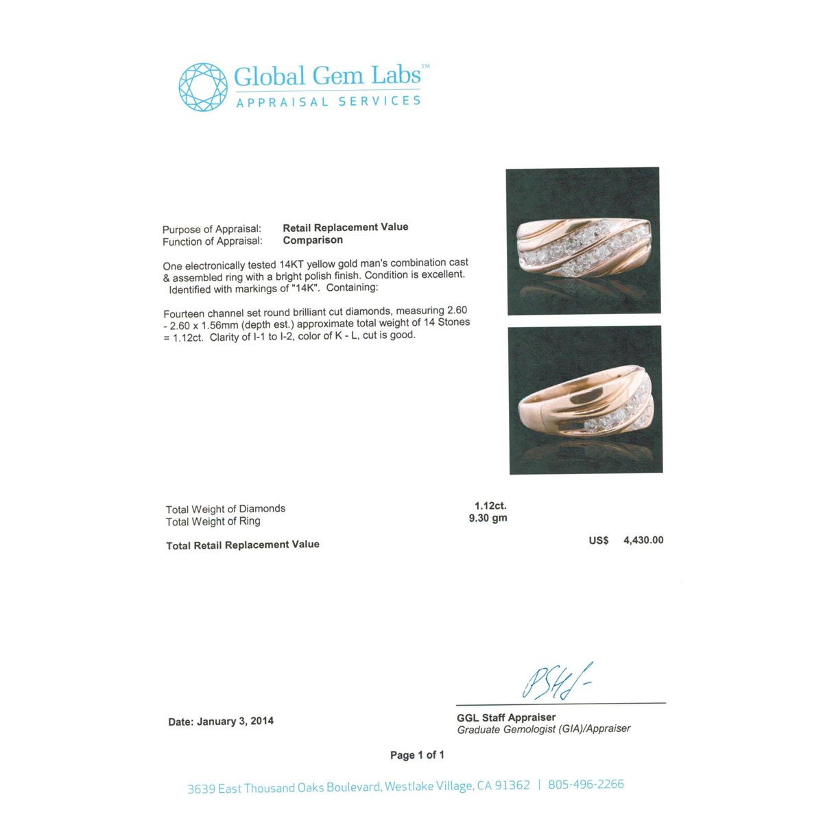 One electronically tested 14KT yellow gold man's combination cast & assembled ring with a bright polish finish. Identified with markings of "14K". Condition is excellent. Containing: Fourteen channel set round brilliant cut diamonds, measuring 2.60 - 2.60 x 1.56mm (depth est.) approximate total weight of 14 Stones = 1.12ct. Clarity of I-1 to I-2, Color of K - L, Cut is Good. Total Weight of Diamonds 1.12ct. Total Weight of Ring 9.30gm. GGL Appraised at $4,430.00.