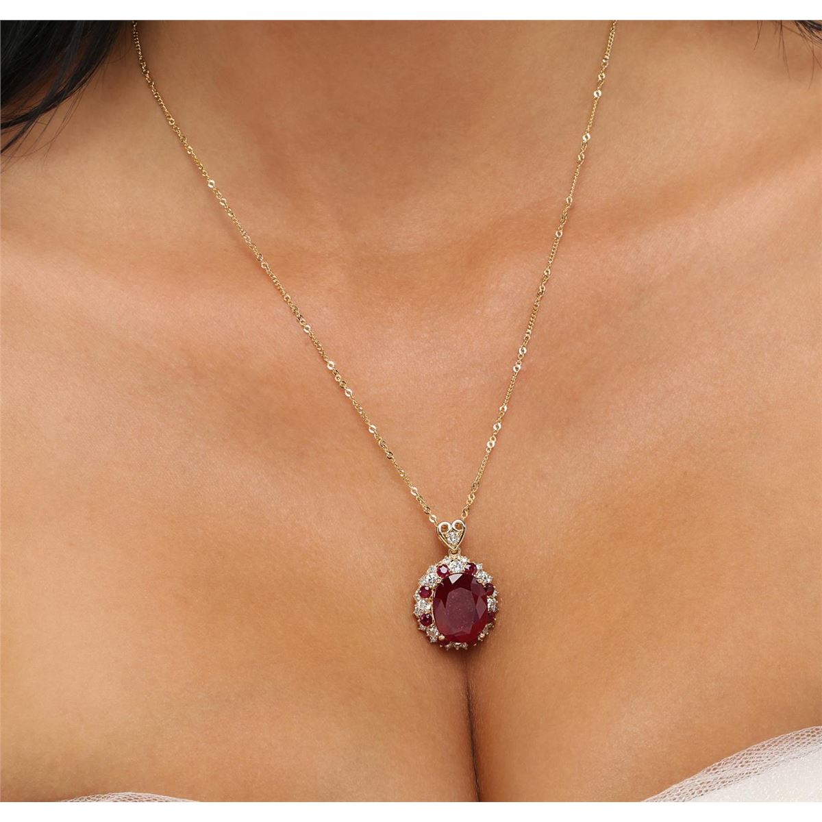 One electronically tested 14KT yellow gold ladies combination cast & assembled ruby and diamond pendant & chain 18.0" long, fancy link with a lobster claw clasp with a bright polish finish. Identified with markings of "14K". Condition is new. Containing: Eight prong set round modified brilliant cut natural rubies, measuring 3.00 - 3.00 x 1.95 mm, approximate total weight of 1.12ct., clarity is heavily included, type II, medium dark, moderately strong, strongly purplish red color, (GIA stpR 6/4), cut is good. Twenty-Five prong set round brilliant cut diamonds, measuring 3.00 - 1.50 x 1.35mm (depth est.) approximate total weight of 25 Stones = 1.50ct. Clarity: SI-2 to I-1. Color: J - K, Cut is Good. Colored gemstones are presumed to have been subjected to commonly used enhancement processes. All diamonds and colored gemstones are graded in the mounting, unless otherwise stated. Total Weight of Colored Stones 1.12ct. Total Weight of Diamonds 1.50ct. Total Weight of Pendant & Chain 9.90 grams. GGL Appraised at $6,280.00.