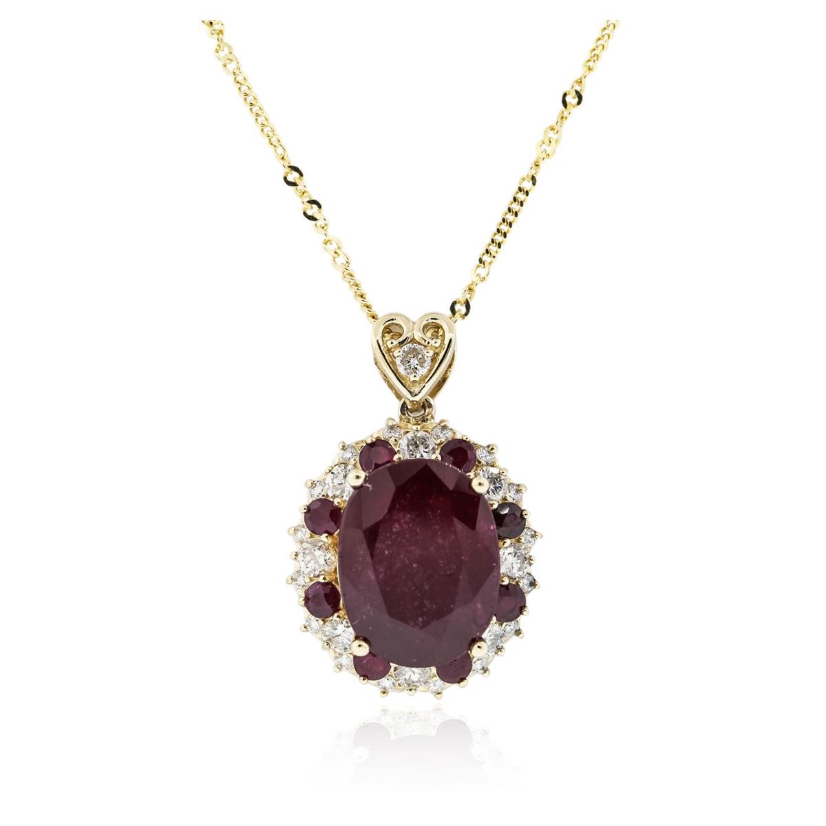 One electronically tested 14KT yellow gold ladies combination cast & assembled ruby and diamond pendant & chain 18.0" long, fancy link with a lobster claw clasp with a bright polish finish. Identified with markings of "14K". Condition is new. Containing: Eight prong set round modified brilliant cut natural rubies, measuring 3.00 - 3.00 x 1.95 mm, approximate total weight of 1.12ct., clarity is heavily included, type II, medium dark, moderately strong, strongly purplish red color, (GIA stpR 6/4), cut is good. Twenty-Five prong set round brilliant cut diamonds, measuring 3.00 - 1.50 x 1.35mm (depth est.) approximate total weight of 25 Stones = 1.50ct. Clarity: SI-2 to I-1. Color: J - K, Cut is Good. Colored gemstones are presumed to have been subjected to commonly used enhancement processes. All diamonds and colored gemstones are graded in the mounting, unless otherwise stated. Total Weight of Colored Stones 1.12ct. Total Weight of Diamonds 1.50ct. Total Weight of Pendant & Chain 9.90 grams. GGL Appraised at $6,280.00.