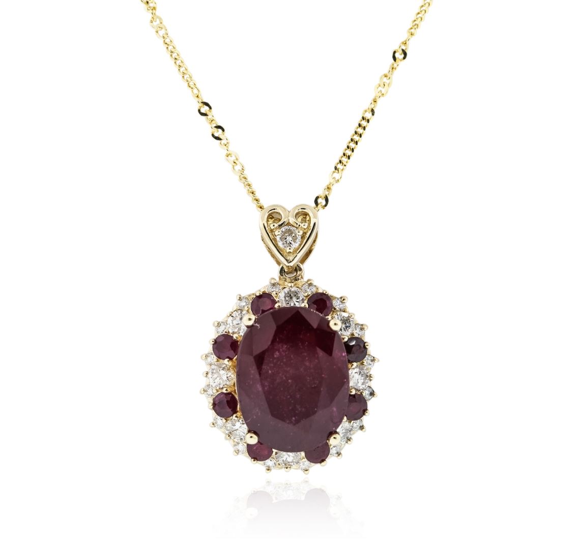 One electronically tested 14KT yellow gold ladies combination cast & assembled ruby and diamond pendant & chain 18.0" long, fancy link with a lobster claw clasp with a bright polish finish. Identified with markings of "14K". Condition is new. Containing: Eight prong set round modified brilliant cut natural rubies, measuring 3.00 - 3.00 x 1.95 mm, approximate total weight of 1.12ct., clarity is heavily included, type II, medium dark, moderately strong, strongly purplish red color, (GIA stpR 6/4), cut is good. Twenty-Five prong set round brilliant cut diamonds, measuring 3.00 - 1.50 x 1.35mm (depth est.) approximate total weight of 25 Stones = 1.50ct. Clarity: SI-2 to I-1. Color: J - K, Cut is Good. Colored gemstones are presumed to have been subjected to commonly used enhancement processes. All diamonds and colored gemstones are graded in the mounting, unless otherwise stated. Total Weight of Colored Stones 1.12ct. Total Weight of Diamonds 1.50ct. Total Weight of Pendant & Chain 9.90 grams. GGL Appraised at $6,280.00.