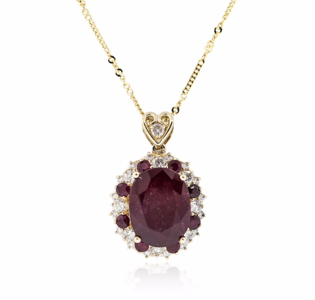 One electronically tested 14KT yellow gold ladies combination cast & assembled ruby and diamond pendant & chain 18.0" long, fancy link with a lobster claw clasp with a bright polish finish. Identified with markings of "14K". Condition is new. Containing: Eight prong set round modified brilliant cut natural rubies, measuring 3.00 - 3.00 x 1.95 mm, approximate total weight of 1.12ct., clarity is heavily included, type II, medium dark, moderately strong, strongly purplish red color, (GIA stpR 6/4), cut is good. Twenty-Five prong set round brilliant cut diamonds, measuring 3.00 - 1.50 x 1.35mm (depth est.) approximate total weight of 25 Stones = 1.50ct. Clarity: SI-2 to I-1. Color: J - K, Cut is Good. Colored gemstones are presumed to have been subjected to commonly used enhancement processes. All diamonds and colored gemstones are graded in the mounting, unless otherwise stated. Total Weight of Colored Stones 1.12ct. Total Weight of Diamonds 1.50ct. Total Weight of Pendant & Chain 9.90 grams. GGL Appraised at $6,280.00.