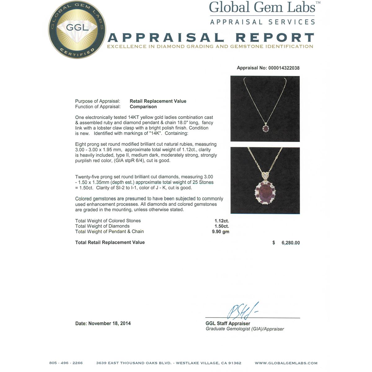 One electronically tested 14KT yellow gold ladies combination cast & assembled ruby and diamond pendant & chain 18.0" long, fancy link with a lobster claw clasp with a bright polish finish. Identified with markings of "14K". Condition is new. Containing: Eight prong set round modified brilliant cut natural rubies, measuring 3.00 - 3.00 x 1.95 mm, approximate total weight of 1.12ct., clarity is heavily included, type II, medium dark, moderately strong, strongly purplish red color, (GIA stpR 6/4), cut is good. Twenty-Five prong set round brilliant cut diamonds, measuring 3.00 - 1.50 x 1.35mm (depth est.) approximate total weight of 25 Stones = 1.50ct. Clarity: SI-2 to I-1. Color: J - K, Cut is Good. Colored gemstones are presumed to have been subjected to commonly used enhancement processes. All diamonds and colored gemstones are graded in the mounting, unless otherwise stated. Total Weight of Colored Stones 1.12ct. Total Weight of Diamonds 1.50ct. Total Weight of Pendant & Chain 9.90 grams. GGL Appraised at $6,280.00.