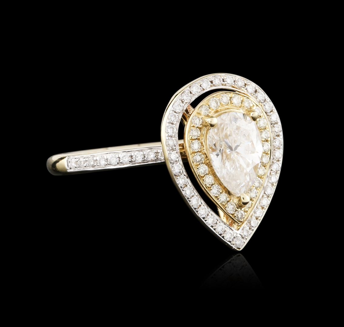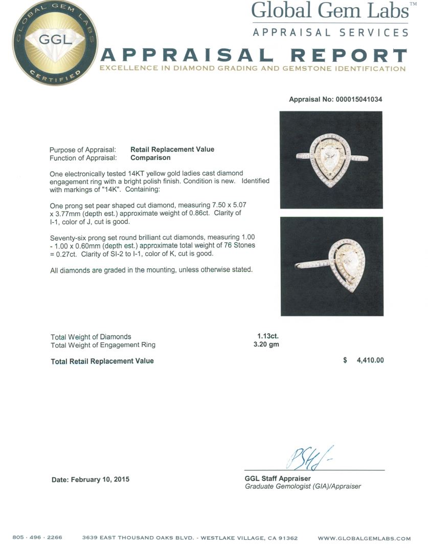 One electronically tested 14KT yellow gold ladies cast diamond engagement ring with a bright polish finish. Identified with markings of "14K". Condition is new. Containing: One prong set pear shaped cut diamond, measuring 7.50 x 5.07 x 3.77mm (depth est.) approximate weight of 0.86ct. Clarity: I-1. Color: J, Cut is Good. Seventy-Six prong set round brilliant cut diamonds, measuring 1.00 - 1.00 x 0.60mm (depth est.) approximate total weight of 76 Stones = 0.27ct. Clarity: SI-2 to I-1. Color: K, Cut is Good. All diamonds are graded in the mounting, unless otherwise stated. Total Weight of Diamonds 1.13ct. Total Weight of Engagement Ring 3.20 grams. GGL Appraised at $4,410.00.