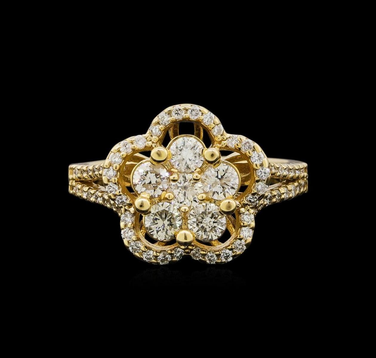 One electronically tested 14KT yellow gold ladies cast diamond ring with a bright polish finish. Identified with markings of "K14". Condition is new. Containing: Six prong set round brilliant cut diamonds, measuring 3.00 - 3.00 x 1.80mm (depth est.) approximate total weight of 6 Stones = 0.74ct. Clarity: SI-2 to I-2. Color: K - L, Cut is Good. Sixty-Two prong set round brilliant cut diamonds, measuring 1.00 - 1.00 x 0.60mm (depth est.) approximate total weight of 62 Stones = 0.40 ct. Clarity: I-1 to I-2. Color: K - L, Cut is Good. Diamonds are graded in the mounting, unless otherwise stated. Total Weight of Diamonds 1.14ct. Total Weight of Ring 4.80 grams. GGL Appraised.