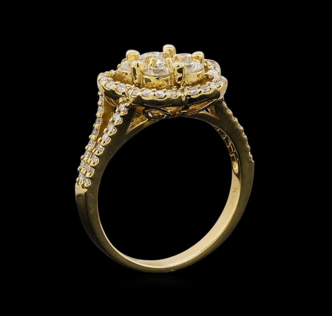 One electronically tested 14KT yellow gold ladies cast diamond ring with a bright polish finish. Identified with markings of "K14". Condition is new. Containing: Six prong set round brilliant cut diamonds, measuring 3.00 - 3.00 x 1.80mm (depth est.) approximate total weight of 6 Stones = 0.74ct. Clarity: SI-2 to I-2. Color: K - L, Cut is Good. Sixty-Two prong set round brilliant cut diamonds, measuring 1.00 - 1.00 x 0.60mm (depth est.) approximate total weight of 62 Stones = 0.40 ct. Clarity: I-1 to I-2. Color: K - L, Cut is Good. Diamonds are graded in the mounting, unless otherwise stated. Total Weight of Diamonds 1.14ct. Total Weight of Ring 4.80 grams. GGL Appraised.