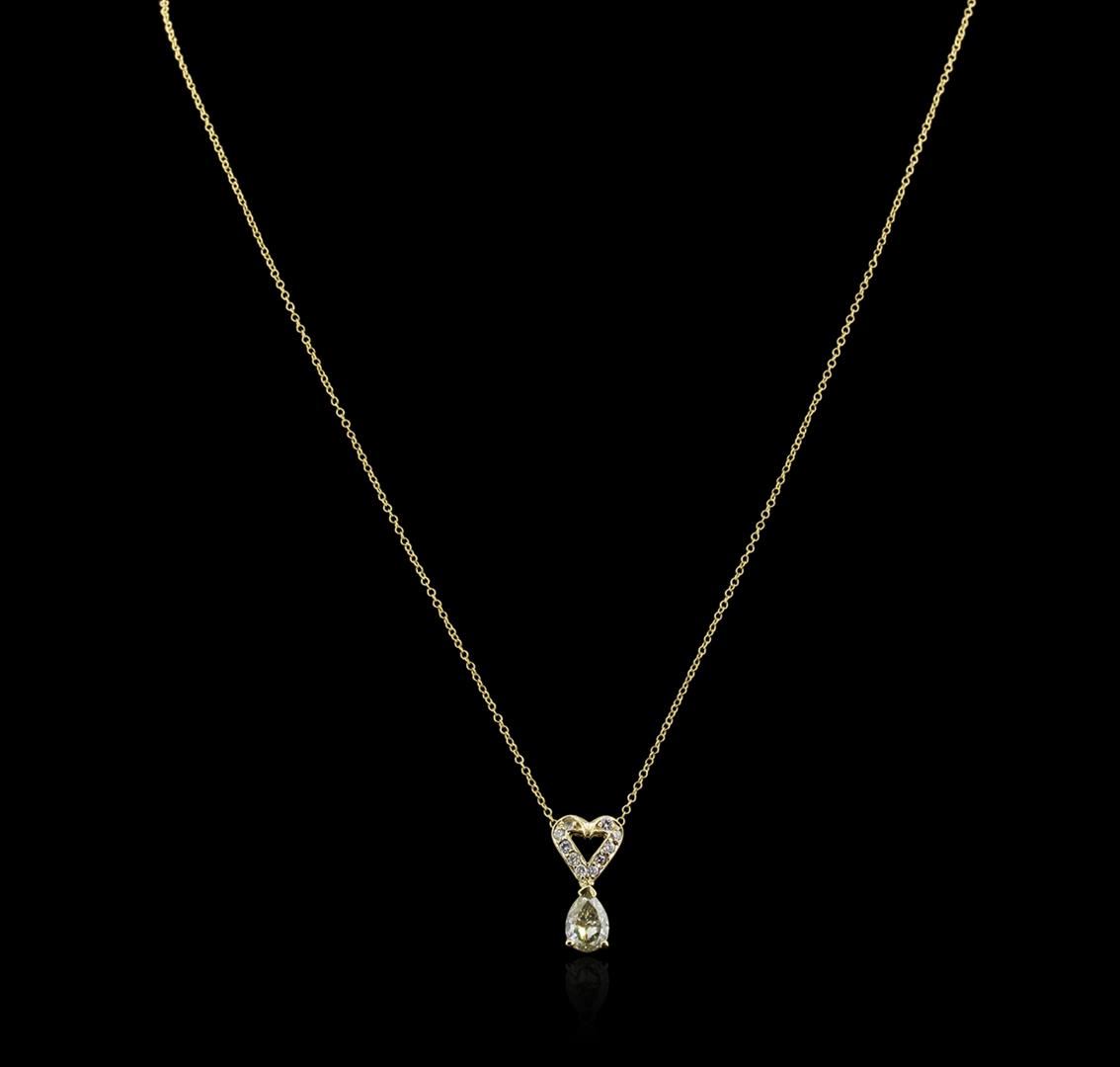 One electronically tested 14KT yellow gold ladies cast diamond pendant & chain 16.0" long, with a spring ring clasp with a bright polish finish. Identified with markings of "14K". Condition is new. Containing: One prong set pear shaped cut diamond, measuring 8.00 x 5.80 x 3.65mm (depth est.) approximate weight of 1.02ct. Clarity: VS-2, Cut is Good. Ten prong set round brilliant cut diamonds, measuring 1.50 - 1.50 x 0.90mm (depth est.) approximate total weight of 10 Stones = 0.12ct. Clarity: SI-1 to SI-2. Color: I - K, Cut is Good. All diamonds are graded in the mounting, unless otherwise stated. Total Weight of Diamonds 1.14ct. Total Weight of Pendant & Chain 2.40 grams. GGL Appraised at $4,700.00.