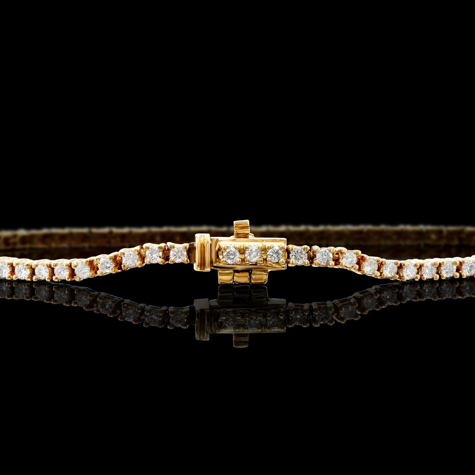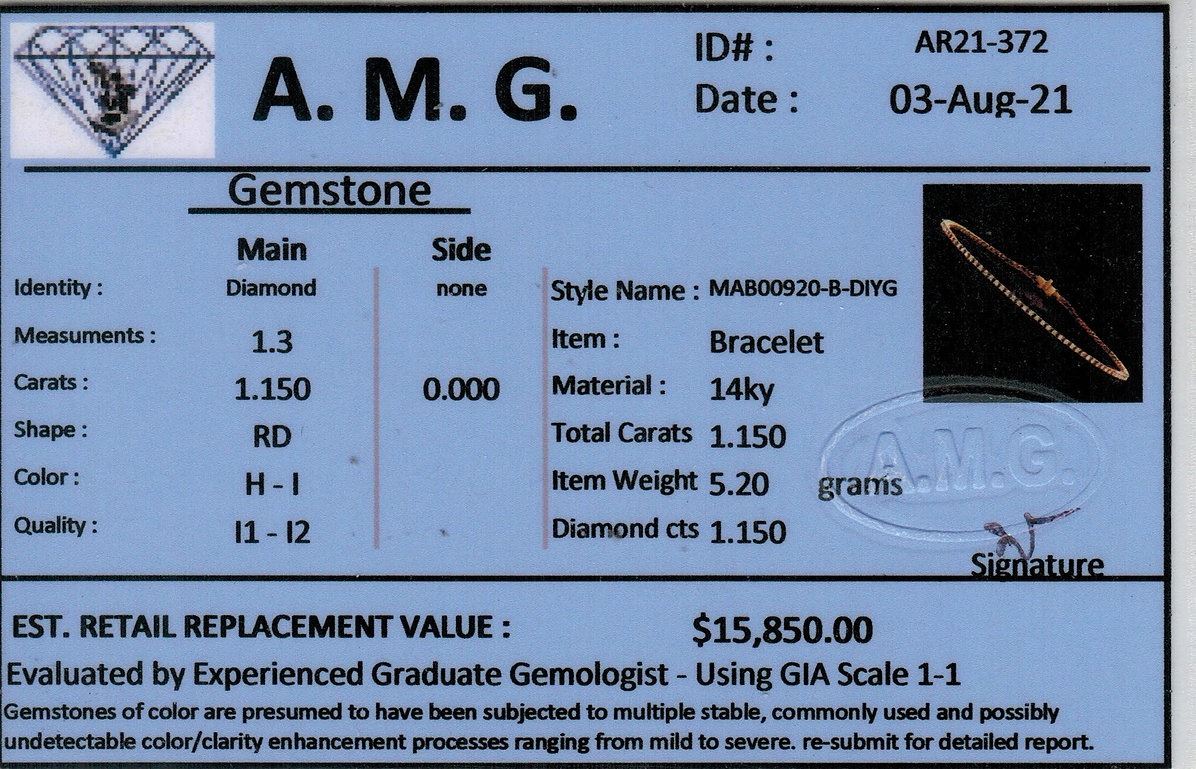 (96) round Diamonds with a total weight of 1.15cts with a color of H-I and clarity of I1-I2. Total weight of this bracelet is 5.20 grams. Length of this bracelet is 7.5 inches.