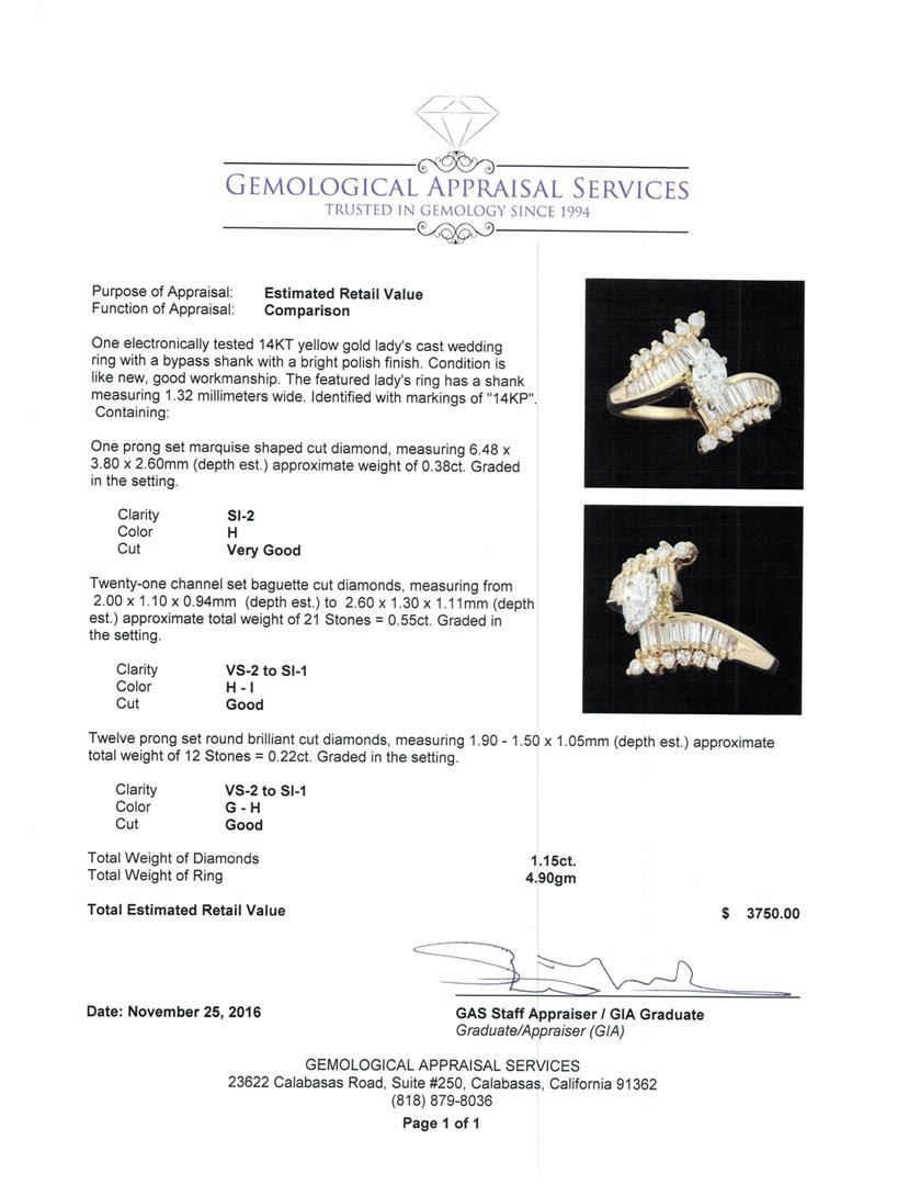 One electronically tested 14KT yellow gold lady's cast wedding ring with a bypass shank with a bright polish finish. The featured lady's ring has a shank measuring 1.32 millimeters wide. Identified with markings of "14KP". Condition is like new, good workmanship. Containing: One prong set marquise shaped cut diamond, measuring 6.48 x 3.80 x 2.60mm (depth est.) approximate weight of 0.38ct. Graded in the setting. Clarity: SI-2. Color: HCut Very Good Twenty-One channel set baguette cut diamonds, measuring from 2.00 x 1.10 x 0.94mm (depth est.) to 2.60 x 1.30 x 1.11mm (depth est.) approximate total weight of 21 Stones = 0.55ct. Graded in the setting. Clarity: VS-2 to SI-1. Color: H - ICut Good Twelve prong set round brilliant cut diamonds, measuring 1.90 - 1.50 x 1.05mm (depth est.) approximate total weight of 12 Stones = 0.22ct. Graded in the setting. Clarity: VS-2 to SI-1. Color: G - HCut Good. Total Weight of Diamonds 1.15ct. Total Weight of Ring 4.90gm. GAS Appraised at $3,750.00.