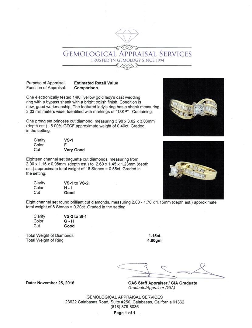 One electronically tested 14KT yellow gold lady's cast wedding ring with a bypass shank with a bright polish finish. The featured lady's ring has a shank measuring 3.03 millimeters wide. Identified with markings of "18KP". Condition is new, good workmanship. Containing: One prong set princess cut diamond, measuring 3.98 x 3.82 x 3.06mm (depth est.) , 5.00.%. GTCF approximate weight of 0.40ct. Graded in the setting. Clarity: VS-1. Color: FCut Very Good Eighteen channel set baguette cut diamonds, measuring from 2.00 x 1.15 x 0.98mm (depth est.) to 2.60 x 1.45 x 1.23mm (depth est.) approximate total weight of 18 Stones = 0.55ct. Graded in the setting. Clarity: VS-1 to VS-2. Color: H - ICut Good Eight channel set round brilliant cut diamonds, measuring 2.00 - 1.70 x 1.15mm (depth est.) approximate total weight of 8 Stones = 0.20ct. Graded in the setting. Clarity: VS-2 to SI-1. Color: G - HCut Good. Total Weight of Diamonds 1.15ct. Total Weight of Ring 4.80gm. GAS Appraised.