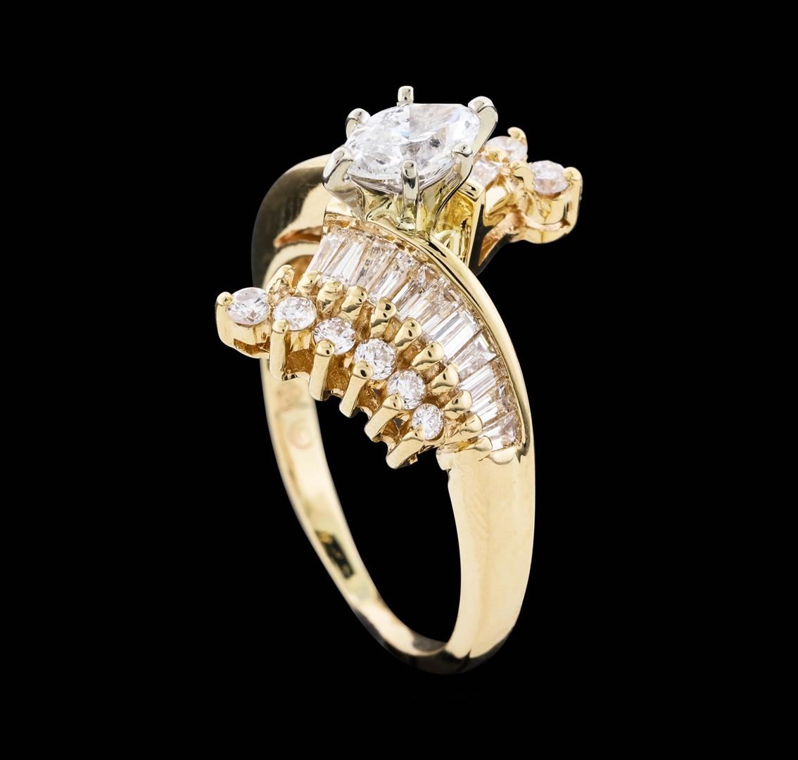 One electronically tested 14KT yellow gold lady's cast wedding ring with a bypass shank with a bright polish finish. The featured lady's ring has a shank measuring 1.32 millimeters wide. Identified with markings of "14KP". Condition is like new, good workmanship. Containing: One prong set marquise shaped cut diamond, measuring 6.48 x 3.80 x 2.60mm (depth est.) approximate weight of 0.38ct. Graded in the setting. Clarity: SI-2. Color: HCut Very Good Twenty-One channel set baguette cut diamonds, measuring from 2.00 x 1.10 x 0.94mm (depth est.) to 2.60 x 1.30 x 1.11mm (depth est.) approximate total weight of 21 Stones = 0.55ct. Graded in the setting. Clarity: VS-2 to SI-1. Color: H - ICut Good Twelve prong set round brilliant cut diamonds, measuring 1.90 - 1.50 x 1.05mm (depth est.) approximate total weight of 12 Stones = 0.22ct. Graded in the setting. Clarity: VS-2 to SI-1. Color: G - HCut Good. Total Weight of Diamonds 1.15ct. Total Weight of Ring 4.90gm. GAS Appraised.