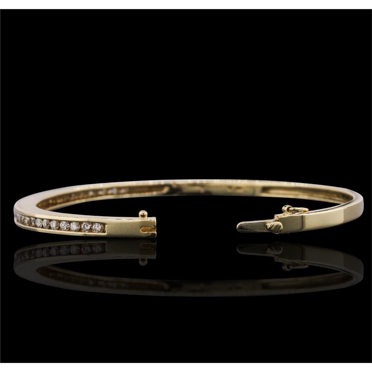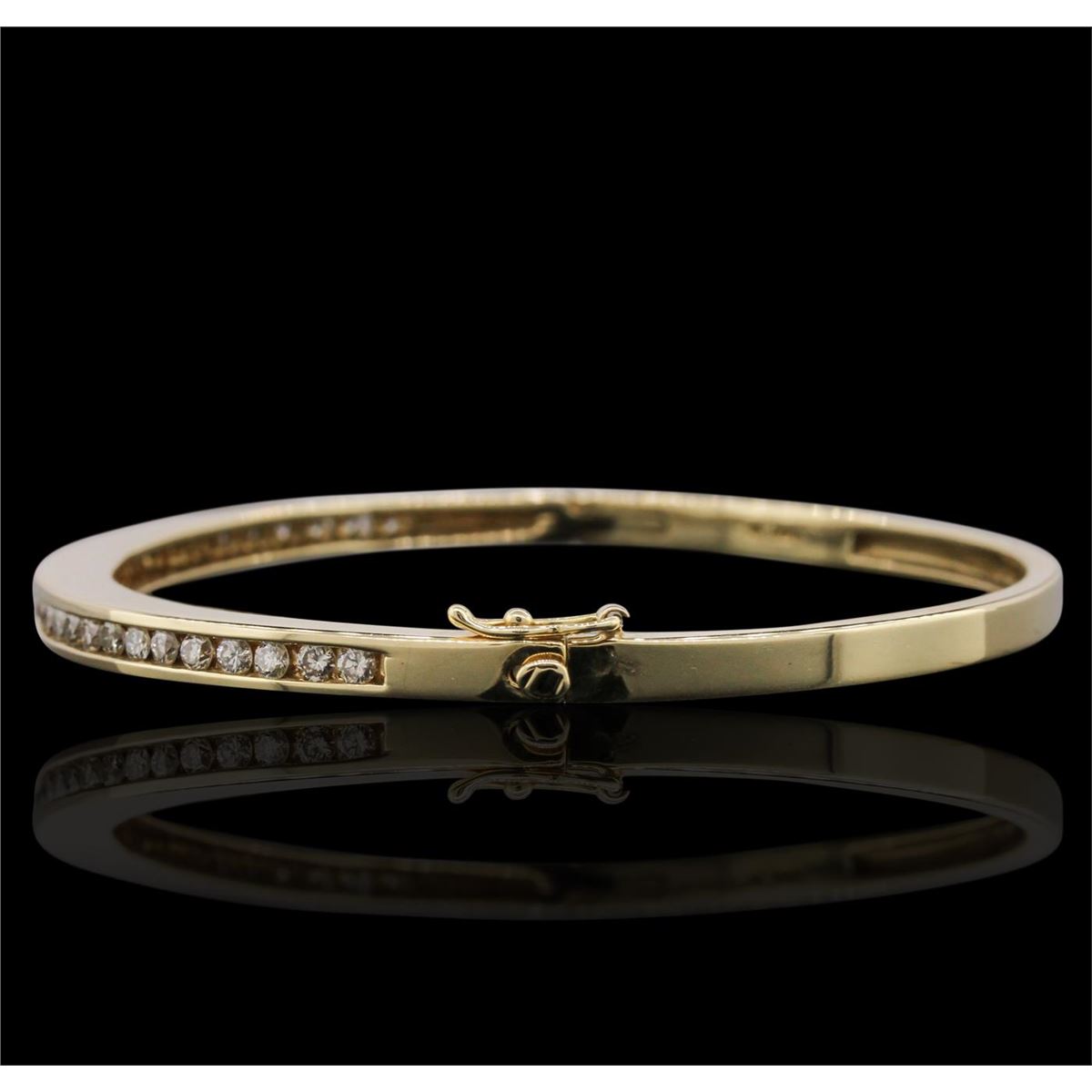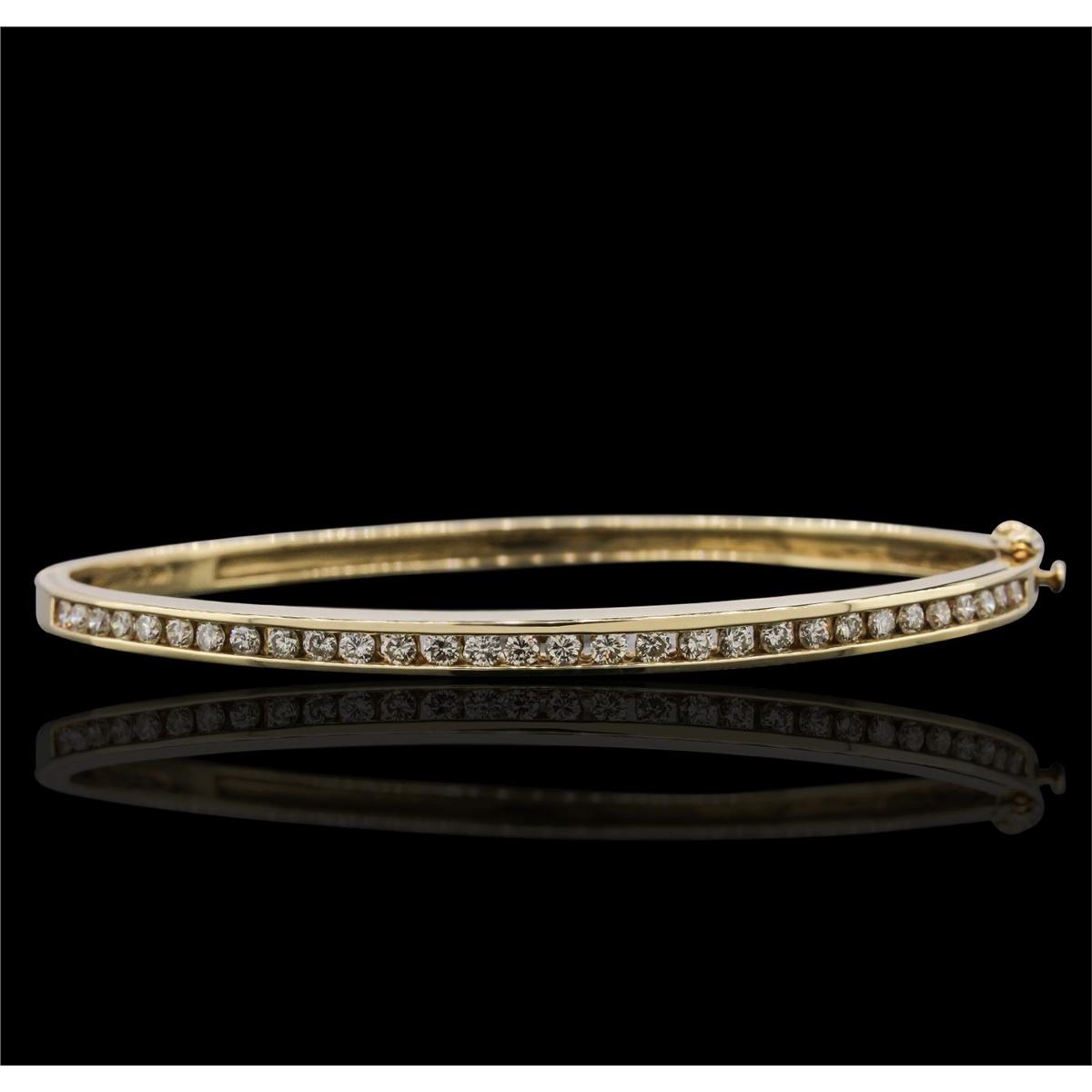 One electronically tested 14KT yellow gold ladies cast & assembled diamond bangle bracelet with a bright polish finish. Condition is good. Six and one-quarter inch length hinged diamond bangle bracelet terminating in a concealed clasp with safety. Identified with markings of "14KP". Containing: Thirty channel set round brilliant cut diamonds, measuring 2.20 - 2.10 x 1.29mm (depth est.) approximate. Total Weight of 30 Stones = 1.18ct. Faint brown secondary color throughout. Graded in the setting. Clarity: VS-2 to SI-2. Color: J - L. Total Weight of Diamonds 1.18ct. Total Weight of Bangle Bracelet 12.60 grams. AIG Appraised at $5,400.00.