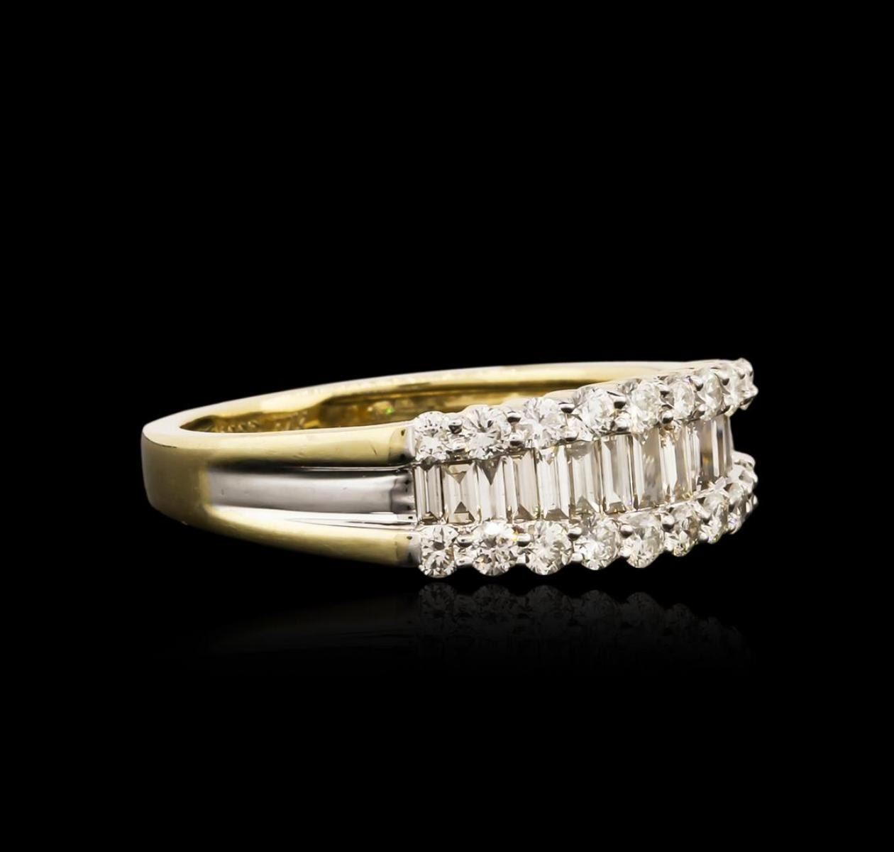 One electronically tested 14KT yellow gold ladies cast diamond ring with a bright and brushed finish. Identified with markings of "14K". Condition is new. Containing: Twenty prong set round brilliant cut diamonds, measuring 2.00 - 2.00 x 1.20mm (depth est.) approximate total weight of 20 Stones = 0.58ct. Clarity: SI-1. Color: I - J, Cut is Good. Fourteen channel set baguette cut diamonds, measuring from 2.00 x 1.50 x 1.28mm (depth est.) to 3.00 x 1.50 x 1.28mm (depth est.) approximate total weight of 14 Stones = 0.62ct. Clarity: VS-2 to SI-1. Color: I - J, Cut is Good. All diamonds are graded in the mounting, unless otherwise stated. Total Weight of Diamonds 1.20ct. Total Weight of Ring 4.50 grams. GGL Appraised.