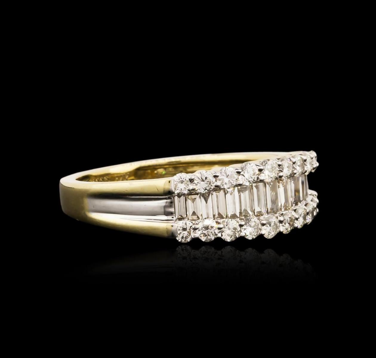 One electronically tested 14KT yellow gold ladies cast diamond ring with a bright and brushed finish. Identified with markings of "14K". Condition is new. Containing: Twenty prong set round brilliant cut diamonds, measuring 2.00 - 2.00 x 1.20mm (depth est.) approximate total weight of 20 Stones = 0.58ct. Clarity: SI-1. Color: I - J, Cut is Good. Fourteen channel set baguette cut diamonds, measuring from 2.00 x 1.50 x 1.28mm (depth est.) to 3.00 x 1.50 x 1.28mm (depth est.) approximate total weight of 14 Stones = 0.62ct. Clarity: VS-2 to SI-1. Color: I - J, Cut is Good. All diamonds are graded in the mounting, unless otherwise stated. Total Weight of Diamonds 1.20 ct. Total Weight of Ring 4.50 grams. GGL Appraised.