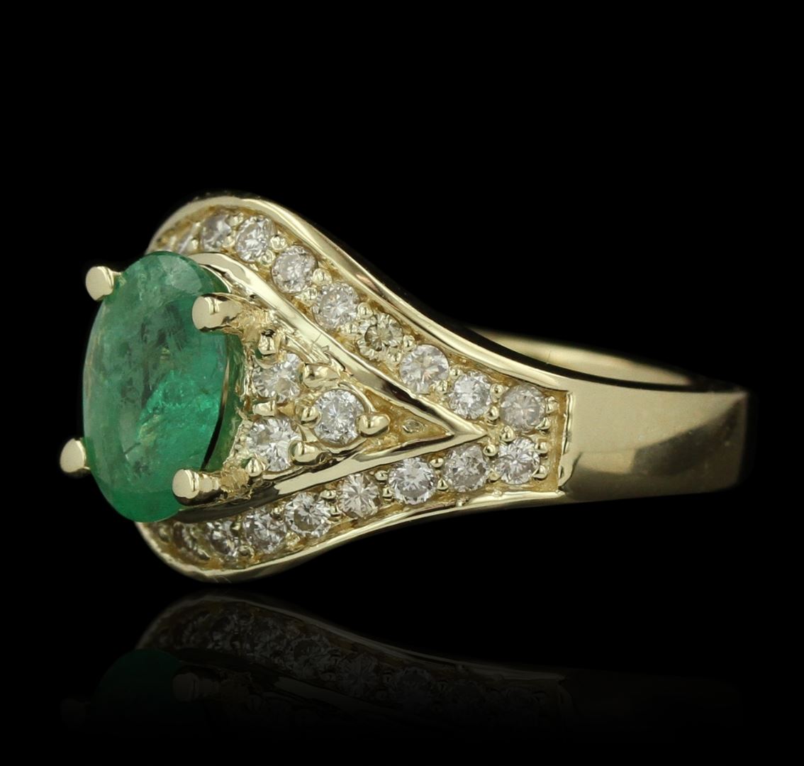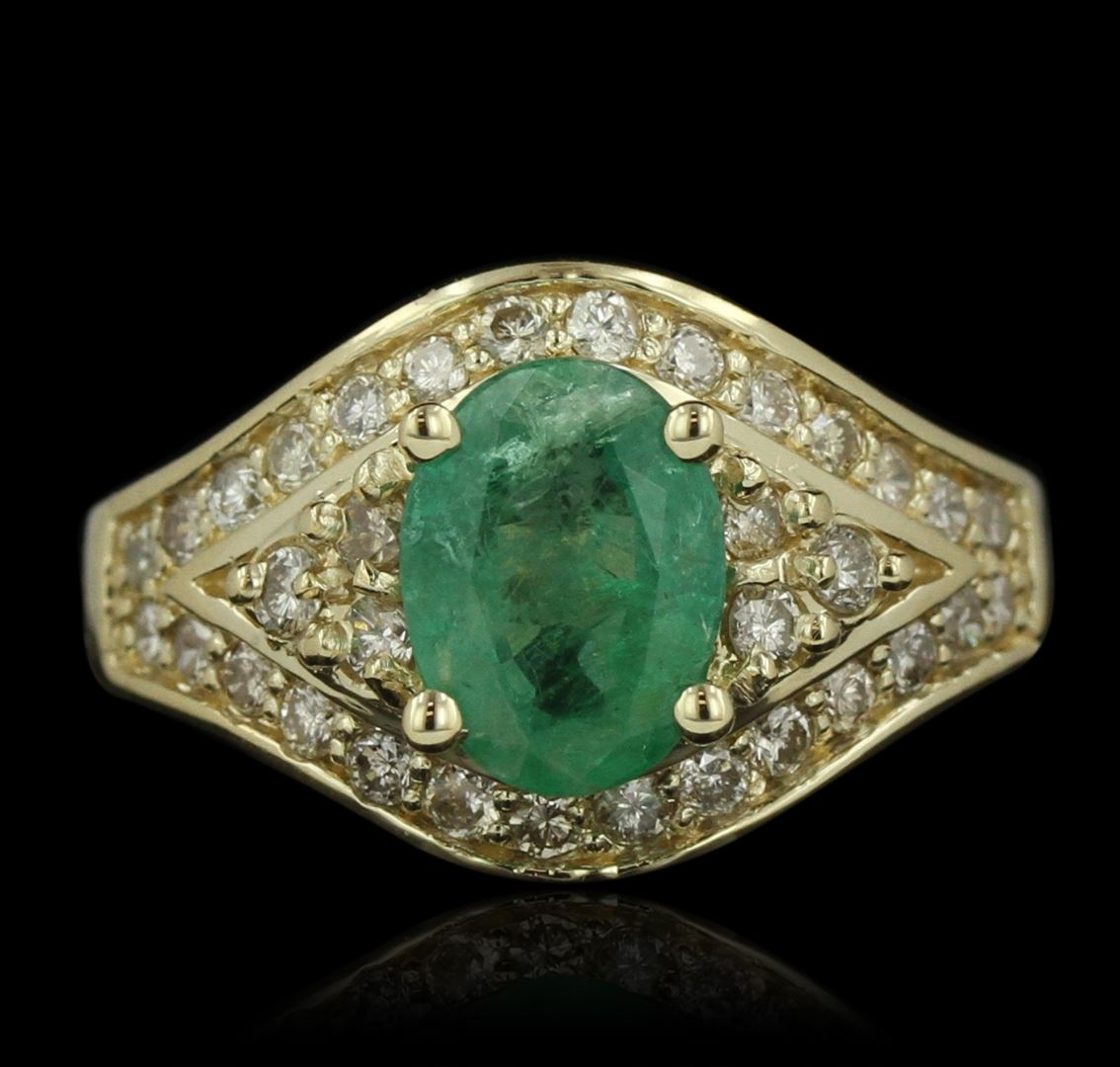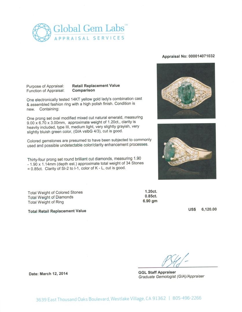 One electronically tested 14KT yellow gold Ladies combination cast & assembled fashion ring with a high polish finish. Condition is new. Containing: One prong set oval modified mixed cut natural emerald, measuring 9.00 x 6.70 x 3.00mm, approximate weight of 1.20ct., clarity is heavily included, type III, medium light, very slightly grayish, very slightly bluish green color, (GIA vslbG 4/3), cut is good. Colored gemstones are presumed to have been subjected to commonly used and possible undetectable color/clarity enhancement processes. Thirty-Four prong set round brilliant cut diamonds, measuring 1.90 - 1.90 x 1.14mm (depth est.) approximate total weight of 34 Stones = 0.85ct. Clarity of SI-2 to I-1, Color of K - L, Cut is Good. Total Weight of Colored Stones 1.20ct. Total Weight of Diamonds 0.85ct. Total Weight of Ring 6.90 grams. GGL Appraised at $6,120.00.