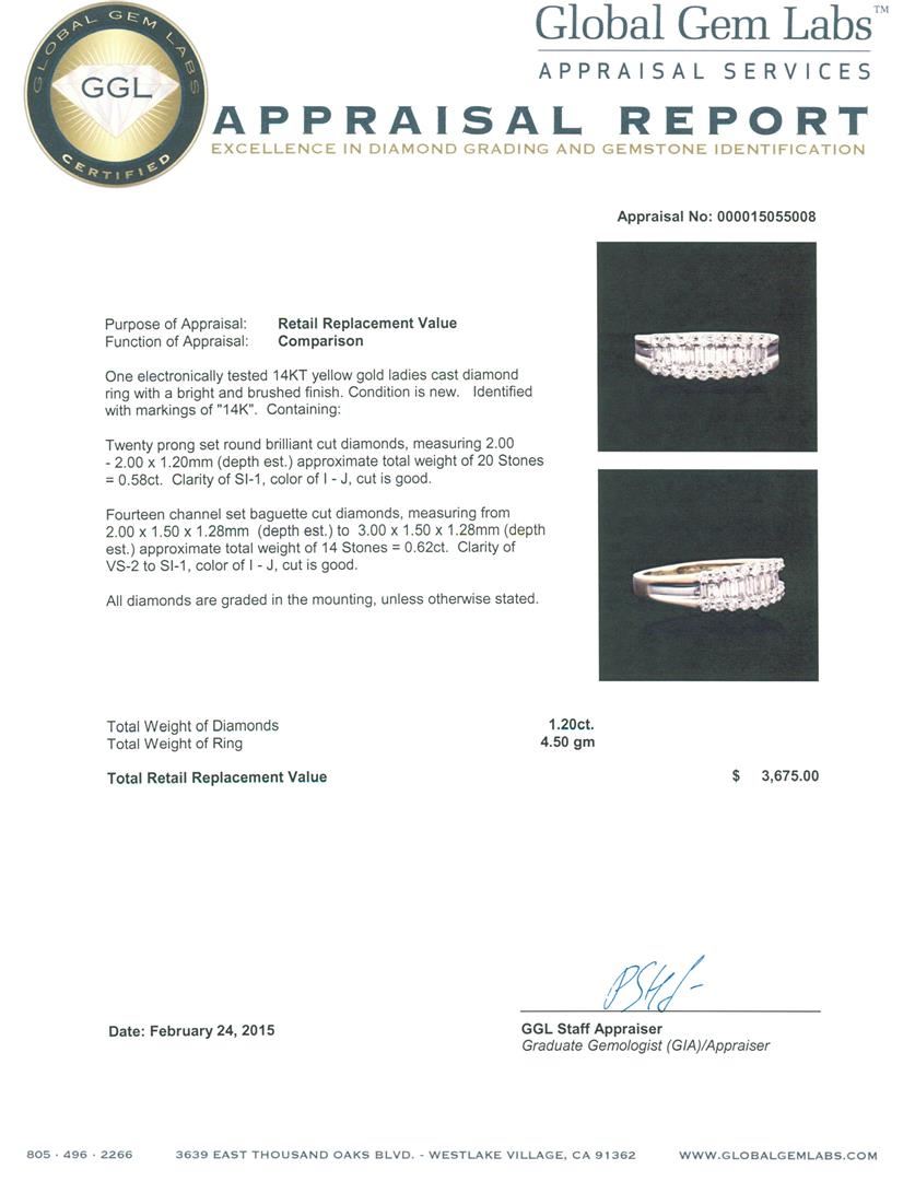 One electronically tested 14KT yellow gold ladies cast diamond ring with a bright and brushed finish. Identified with markings of "14K". Condition is new. Containing: Twenty prong set round brilliant cut diamonds, measuring 2.00 - 2.00 x 1.20mm (depth est.) approximate total weight of 20 Stones = 0.58ct. Clarity: SI-1. Color: I - J, Cut is Good. Fourteen channel set baguette cut diamonds, measuring from 2.00 x 1.50 x 1.28mm (depth est.) to 3.00 x 1.50 x 1.28mm (depth est.) approximate total weight of 14 Stones = 0.62ct. Clarity: VS-2 to SI-1. Color: I - J, Cut is Good. All diamonds are graded in the mounting, unless otherwise stated. Total Weight of Diamonds 1.20ct. Total Weight of Ring 4.50 grams. GGL Appraised at $3,675.00.