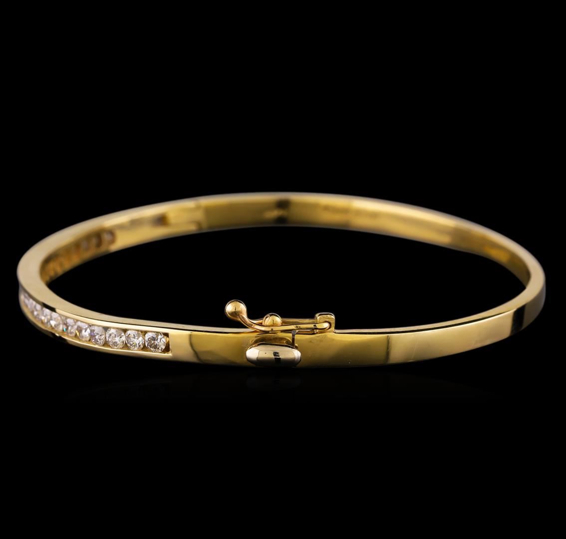 One electronically tested 14KT yellow gold ladies cast diamond bangle bracelet with a hidden box clasp with a bright polish finish. Identified with markings of "14K". Condition is new. Containing: Twenty-Four channel set round brilliant cut diamonds, measuring 2.40 - 2.40 x 1.44mm (depth est.) approximate total weight of 24 Stones = 1.21ct. Clarity: I-1 to I-2. Color: J - K, Cut is Good. All diamonds are graded in the mounting, unless otherwise stated. Total Weight of Diamonds 1.21ct. Total Weight of Bangle Bracelet 14.09 grams. GGL Appraised.