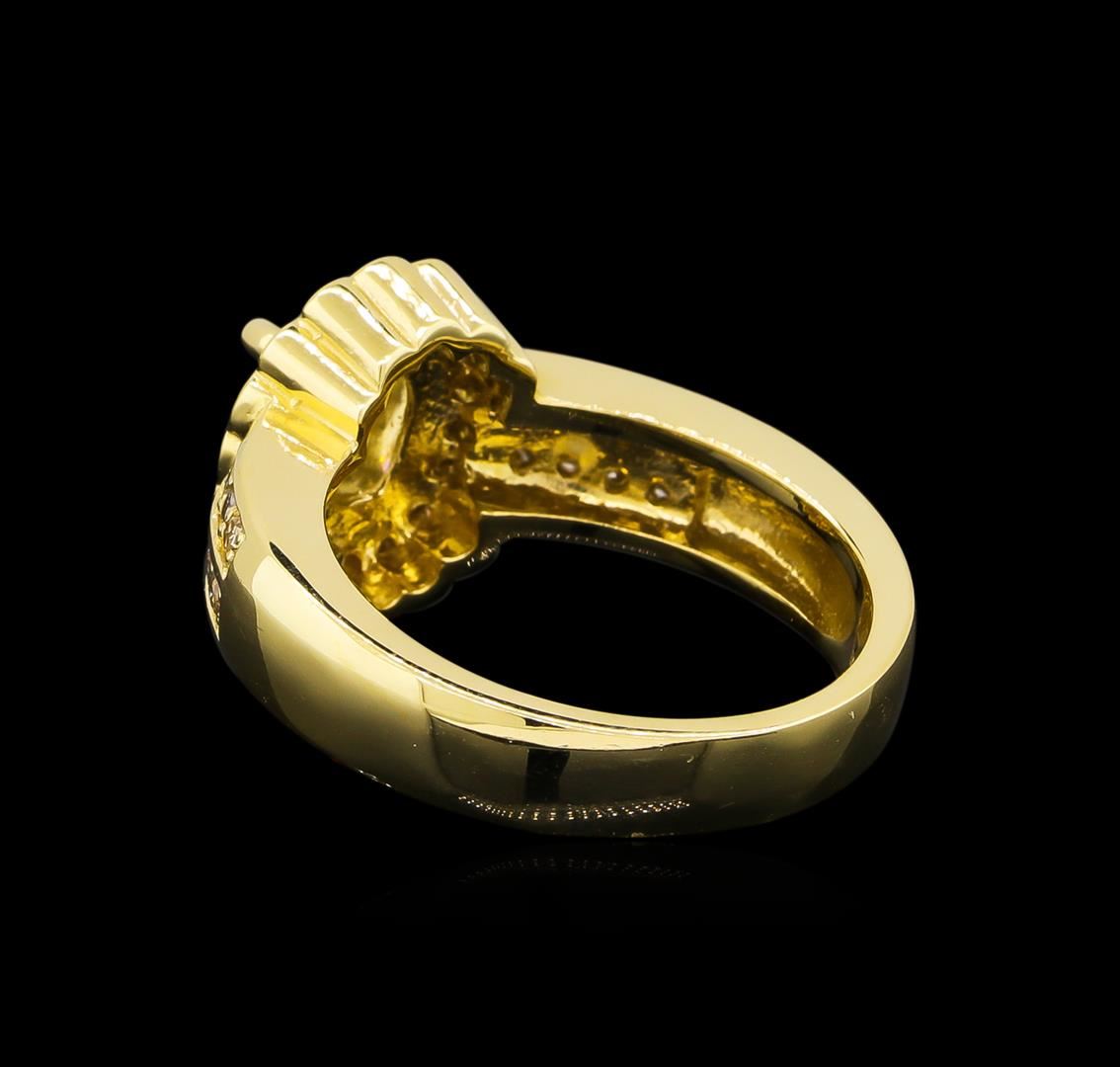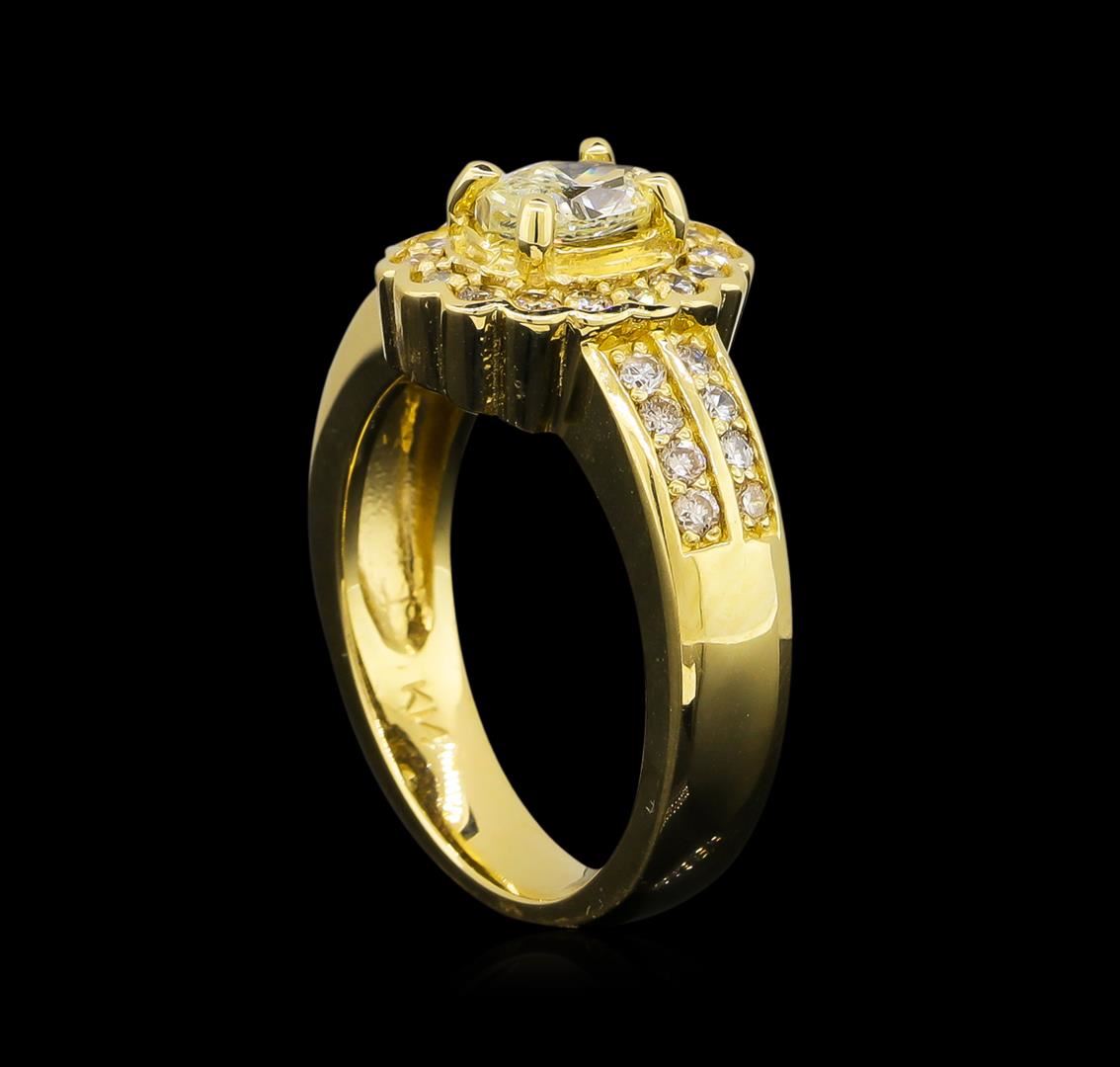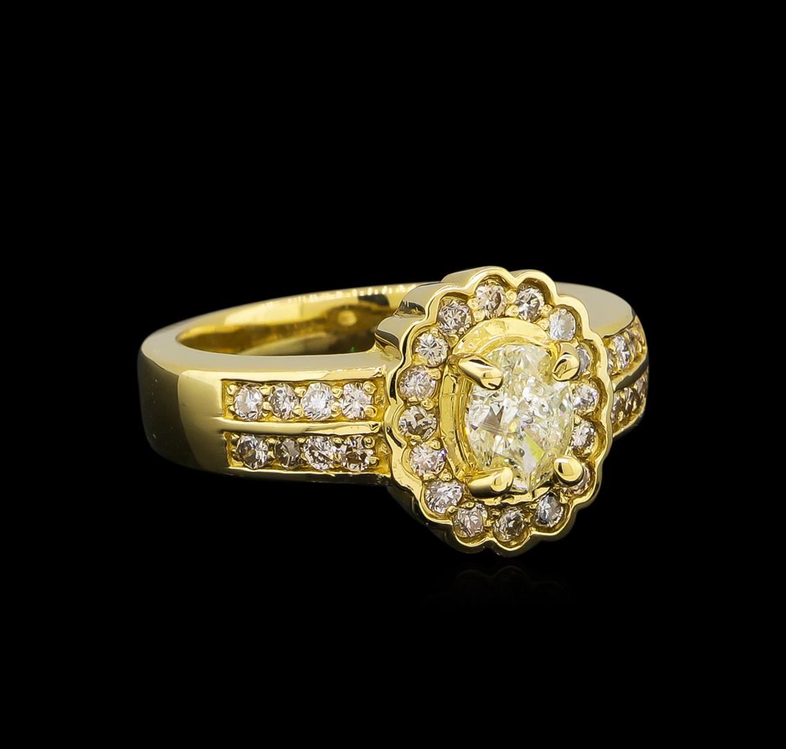 One electronically tested 14KT yellow gold ladies cast diamond unity ring with a bright polish finish. Condition is new, good workmanship. The featured diamond is set within a stylized diamond bezel supported by diamond set shoulders, completed by a three and one-half millimeter wide band. Identified with markings of "K14". Containing: One prong set oval shaped cut diamond, measuring 6.15 x 4.65 x 2.85mm (depth est.) approximate weight of 0.61ct with a faint blue fluorescence. Graded in the setting. Clarity: I-2. Depth: 61.3%. Table 55.9%. Thirty-Two prong set round brilliant cut diamonds, measuring 1.70 - 1.60 x 0.99mm (depth est.) approximate. Total Weight of 32 Stones = 0.62ct. Graded in the setting. Clarity: SI-1 to I-1. Color: H - J. Total Weight of Diamonds 1.23ct. Total Weight of Ring 7.61 grams. AIG Appraised at $4,770.00.
