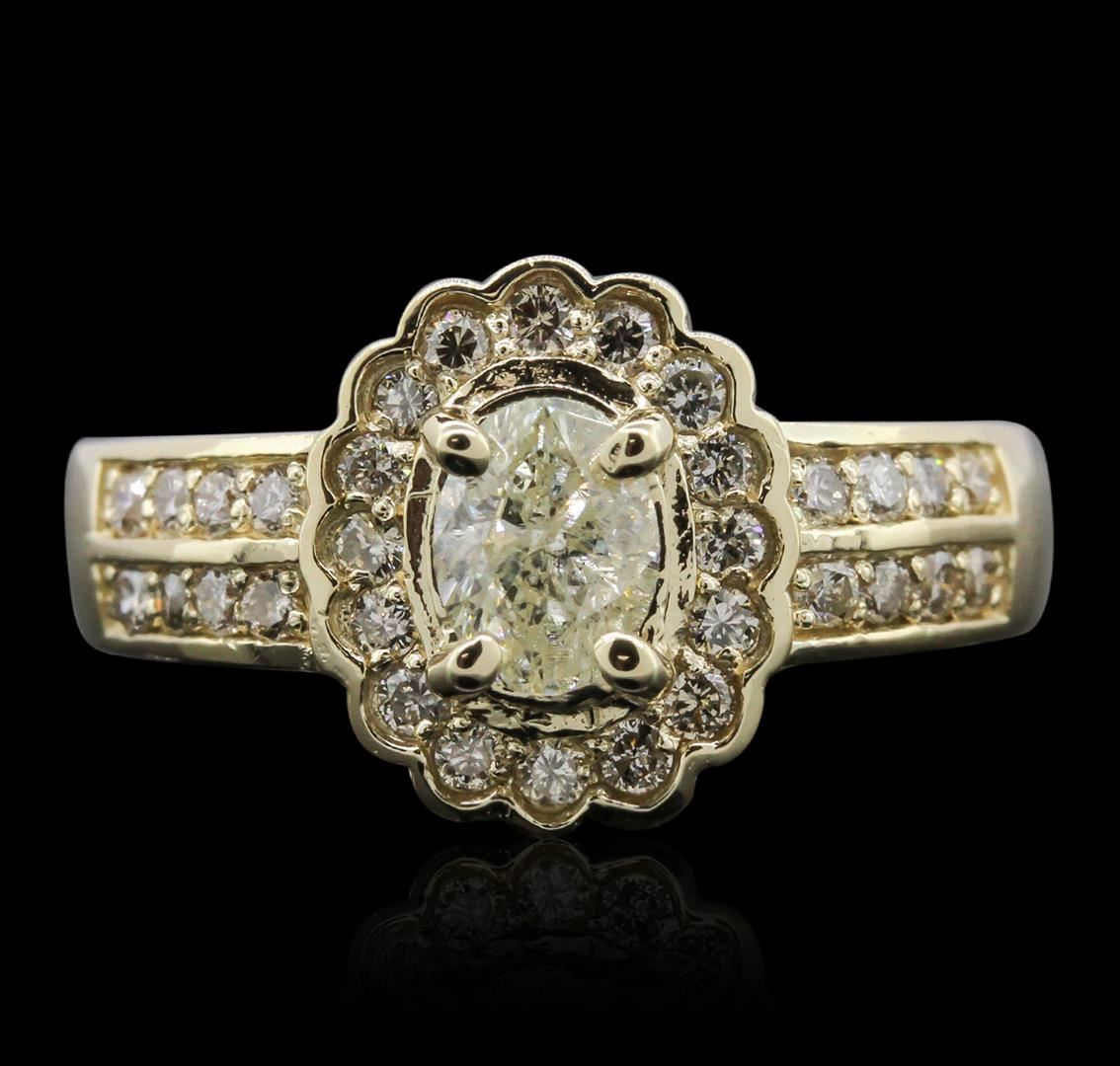 One electronically tested 14KT yellow gold ladies cast diamond unity ring with a bright polish finish. Condition is new, good workmanship. The featured diamond is set within a stylized diamond bezel supported by diamond set shoulders, completed by a three and one-half millimeter wide band. Identified with markings of "K14". Containing: One prong set oval shaped cut diamond, measuring 6.15 x 4.65 x 2.85mm (depth est.) approximate weight of 0.61ct with a faint blue fluorescence. Graded in the setting. Clarity: I-2. Depth: 61.3%. Table 55.9%. Thirty-Two prong set round brilliant cut diamonds, measuring 1.70 - 1.60 x 0.99mm (depth est.) approximate. Total Weight of 32 Stones = 0.62ct. Graded in the setting. Clarity: SI-1 to I-1. Color: H - J. Total Weight of Diamonds 1.23ct. Total Weight of Ring 7.61 grams. AIG Appraised at $4,770.00.