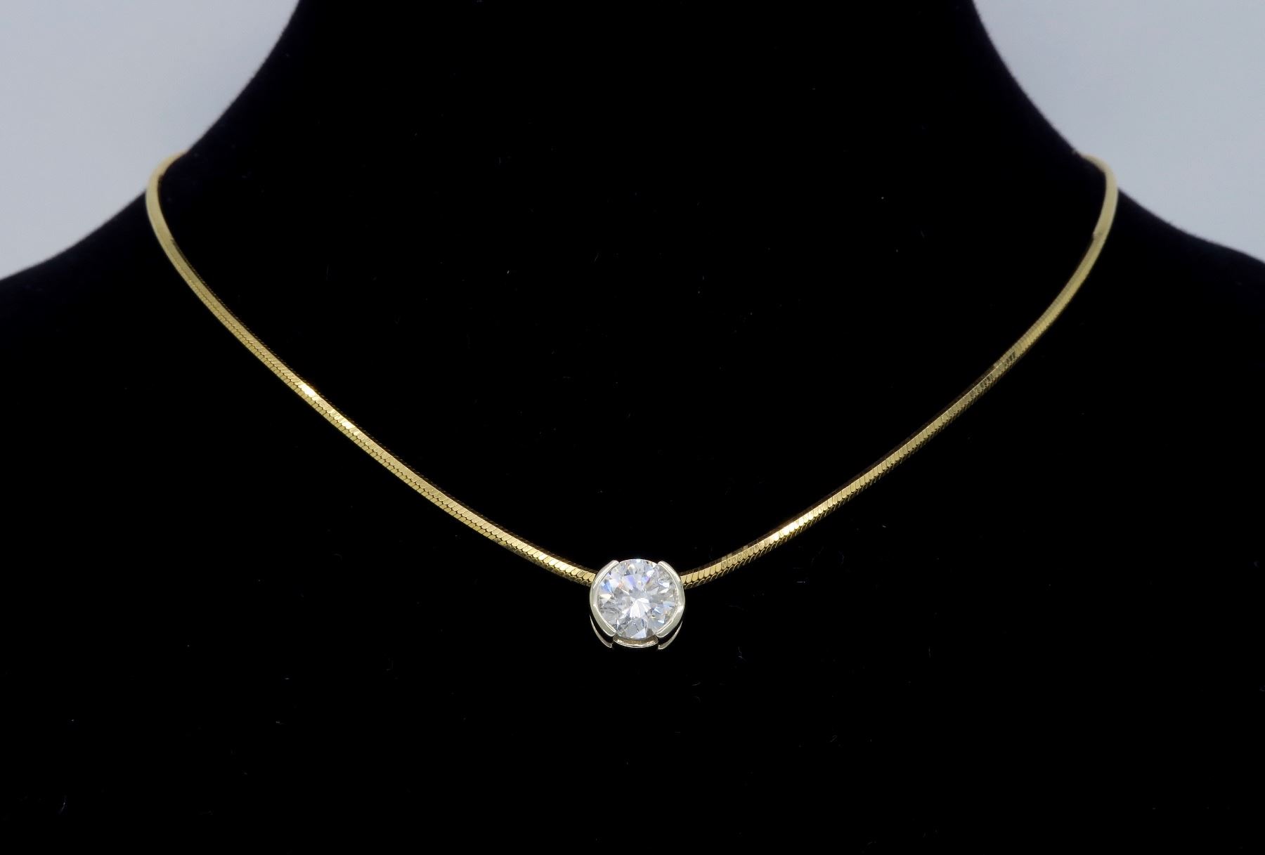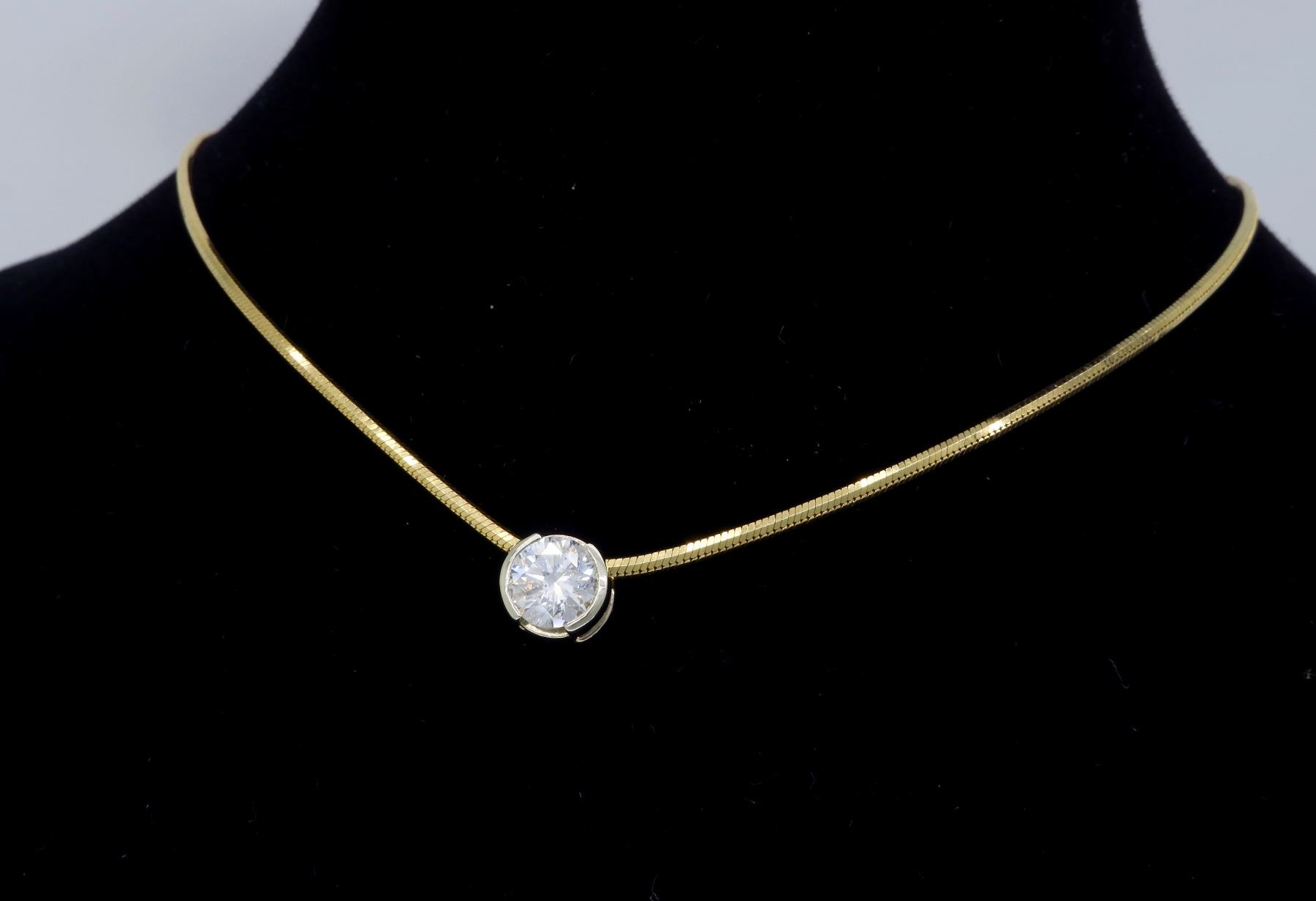 One 14KT Yellow Gold 1.25ct Diamond Pendant with Chain. (1) Round Diamond with a total weight of 1.25cts with a color of G-H and clarity of I-1. Total weight of this pendant with chain is 11.2 grams. Total length of this chain is 18 inches.