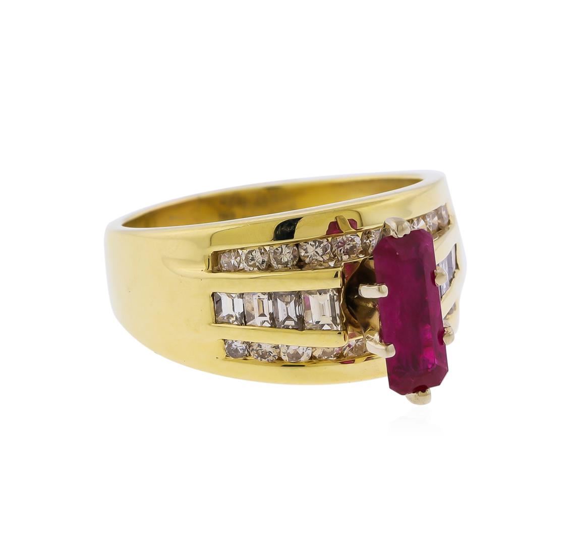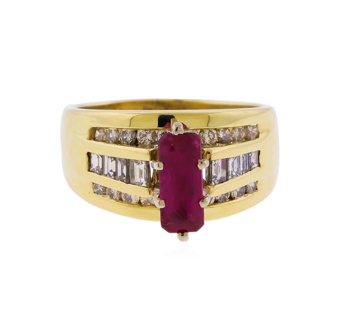 Fourteen Karat (14K) yellow gold ruby and diamond ring. An emerald cut Ruby corundum gemstone, weighing approximately 1.25cts, is prong mounted in the center of the ring. Surrounded by round brilliant and baguette cut diamonds, weighing approximately 1.50ctw with an Average Clarity of VS2-SI1 and an Average Color of G-I. The ring is cast stamped "14k" and has a gross weight of 10.1 Grams. GGA Appraised at $2,590.00.