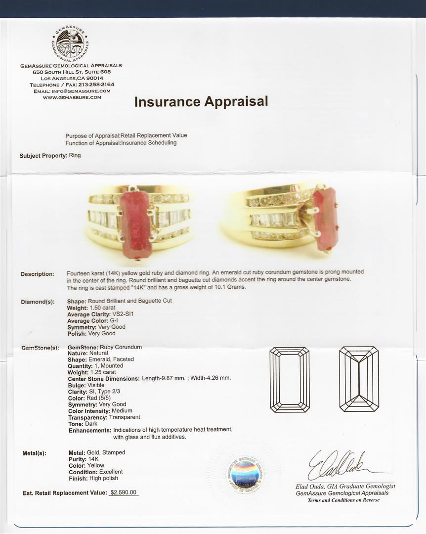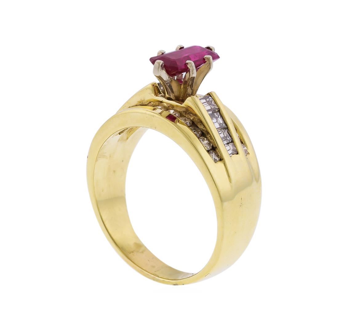 Fourteen Karat (14K) yellow gold ruby and diamond ring. An emerald cut Ruby corundum gemstone, weighing approximately 1.25cts, is prong mounted in the center of the ring. Surrounded by round brilliant and baguette cut diamonds, weighing approximately 1.50ctw with an Average Clarity of VS2-SI1 and an Average Color of G-I. The ring is cast stamped "14k" and has a gross weight of 10.1 Grams. GGA Appraised at $2,590.00.