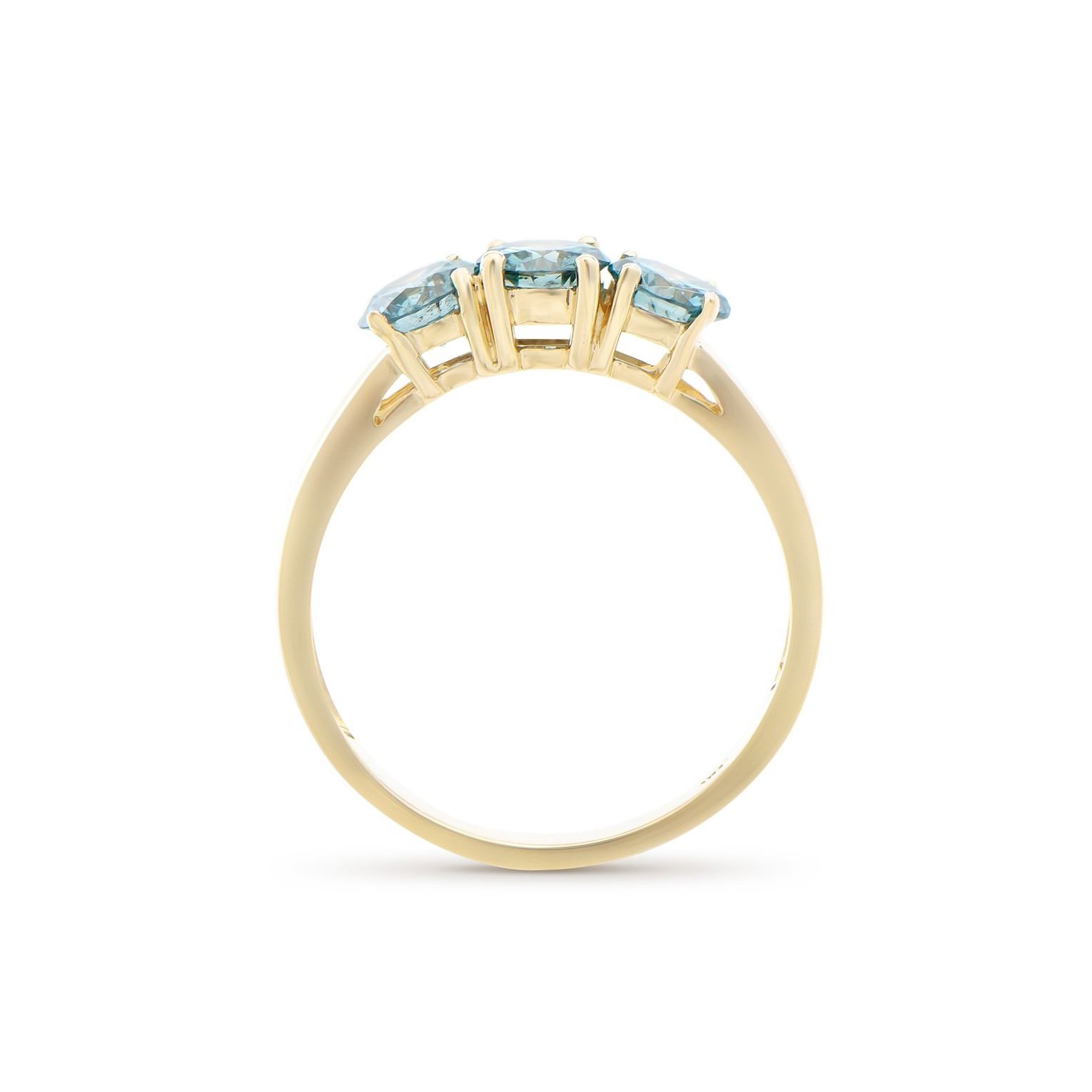 (3) round Blue Diamonds with a total weight of 1.26cts with a color of Blue and clarity of I1-I2. Total weight of this ring is 2.3 grams. Ring size is 7.5.