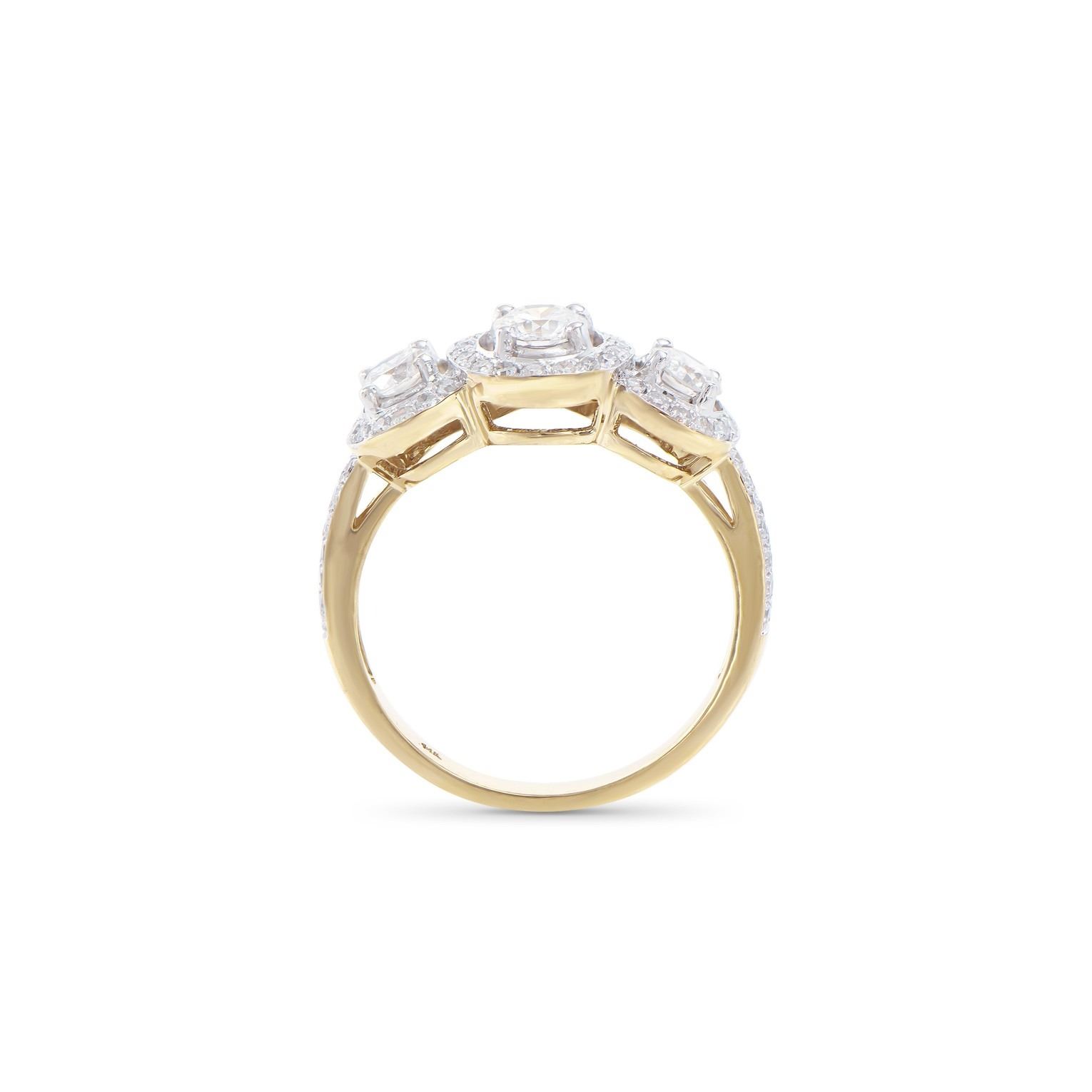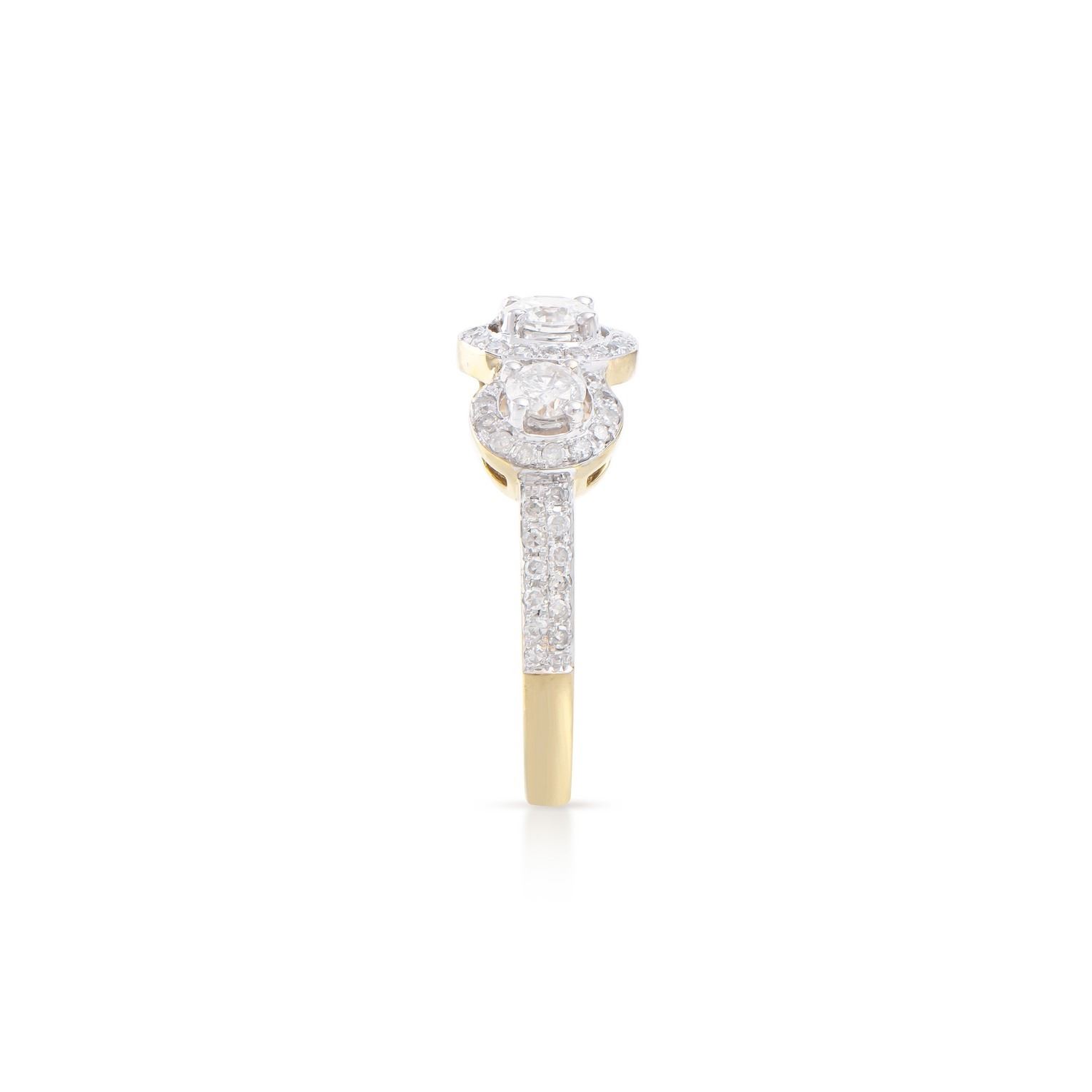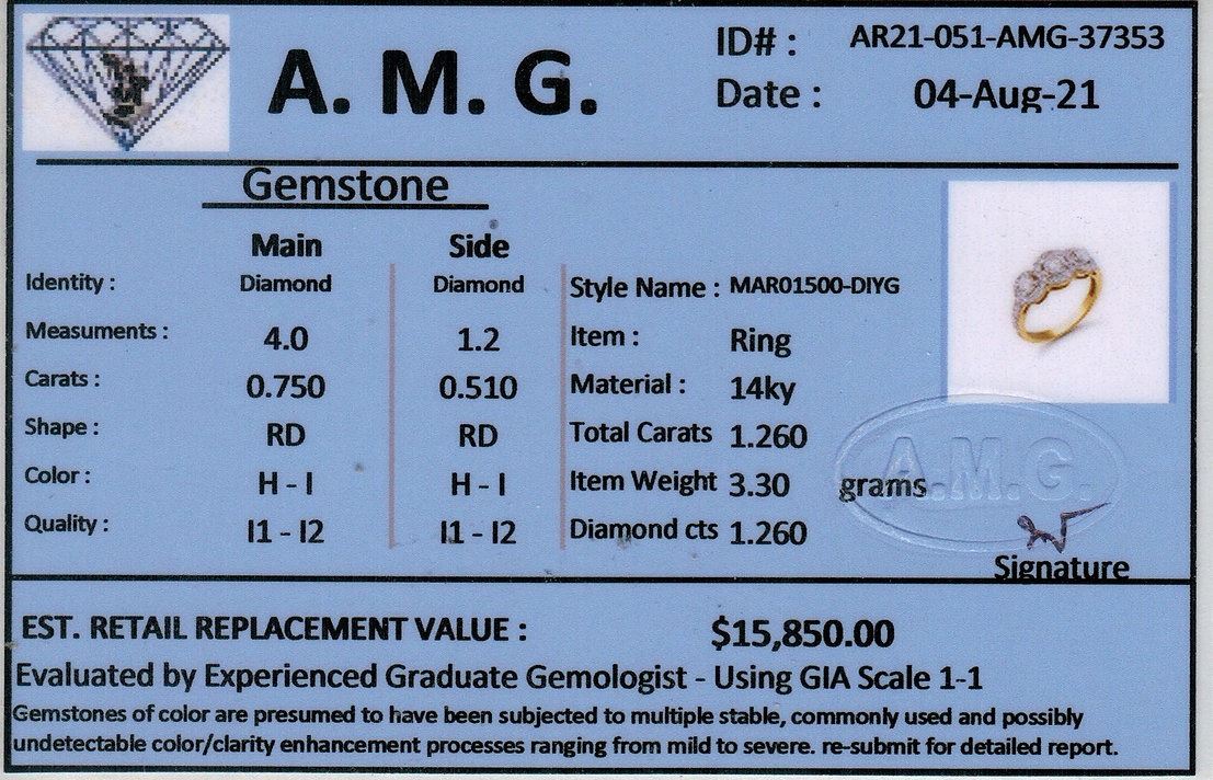 (3) round Diamonds with a total weight of 0.75cts with a color of H-I and clarity of I1-I2. (63) round Diamonds with a total weight of 0.51cts with a color of H-I and clarity of I1-I2. Total weight of this ring is 3.3 grams. Ring size is 7.5.
