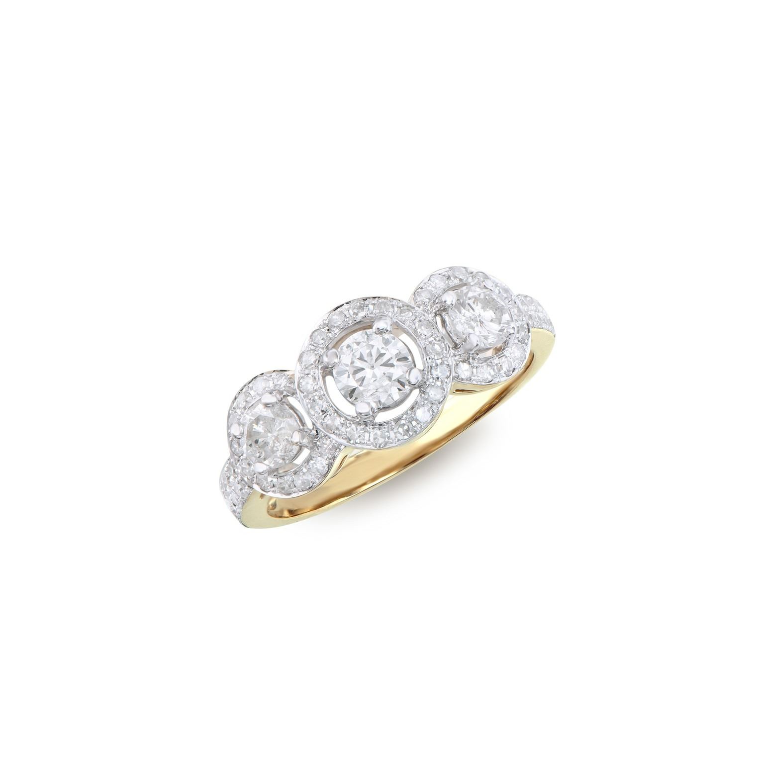 (3) round Diamonds with a total weight of 0.75cts with a color of H-I and clarity of I1-I2. (63) round Diamonds with a total weight of 0.51cts with a color of H-I and clarity of I1-I2. Total weight of this ring is 3.3 grams. Ring size is 7.5.