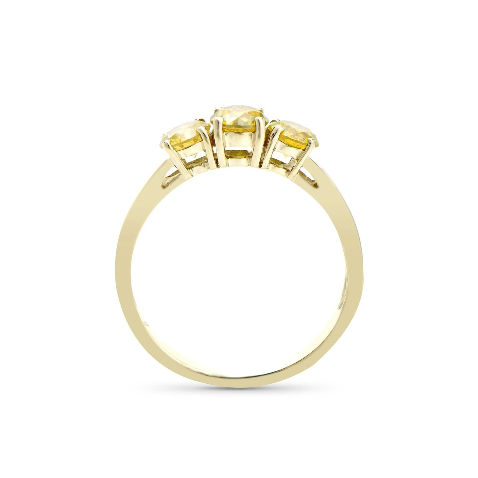 (3) round Yellow Diamonds with a total weight of 1.26cts with a color of Yellow and clarity of I1-I2. Total weight of this ring is 2.3 grams. Ring size is 7.5.