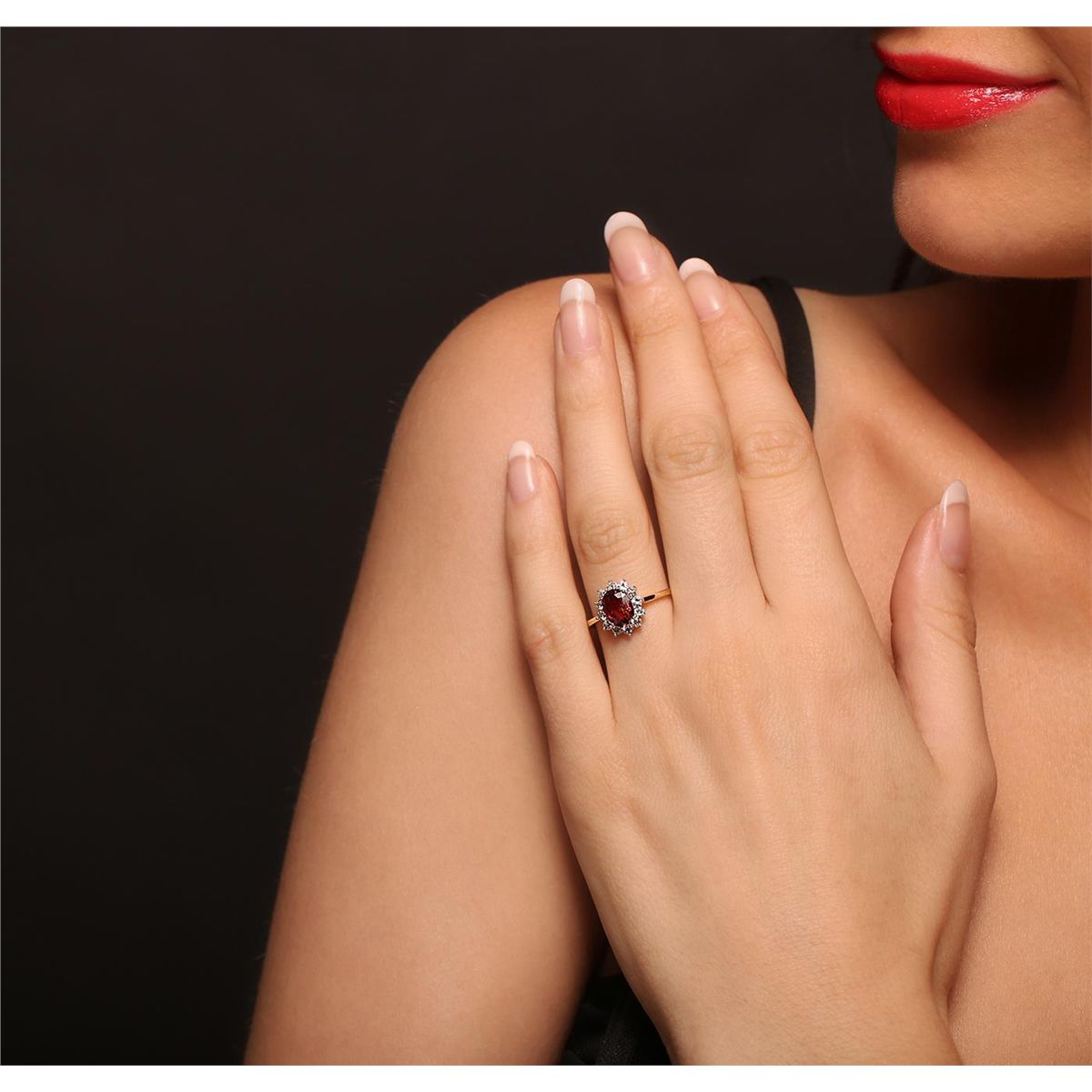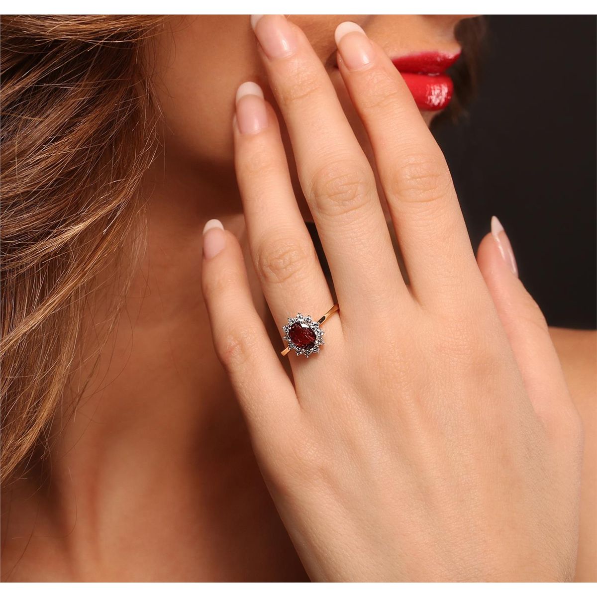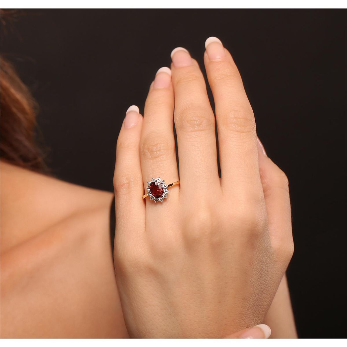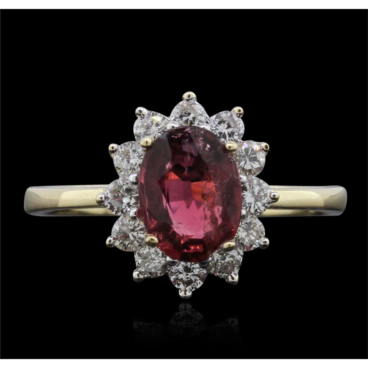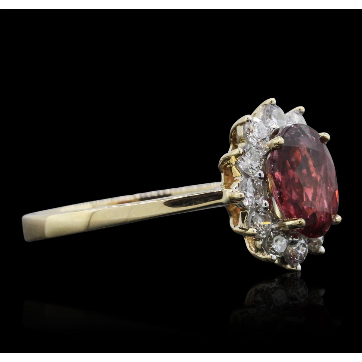 One electronically tested 14KT yellow gold ladies cast tourmaline and diamond ring. Condition is new, good workmanship. The featured tourmaline is set within a diamond floret supported by tapering shoulders, completed by a two millimeter wide band. Bright polish finish with rhodium accents. Trademark is Orianne. Identified with markings of "14K". Containing: One prong set oval mixed cut natural rubellite, measuring 7.90 x 6.00 x 3.56mm, 15%. bulge factor, approximate weight of 1.27ct., clarity is moderately included, type III, medium, very slightly brownish, slightly purplish red color, (GIA slpR 5/3), cut is good. Transmitting light with a minimum of distortion, transparent. Naturally occurring internal & external characteristics are present. Graded in the setting. Twelve prong set round brilliant cut diamonds, measuring 2.20 - 2.10 x 1.29mm (depth est.) approximate. Total Weight of 12 Stones = 0.42ct. Graded in the setting. Clarity: SI-1 to I-1. Color: G - I. Total Weight of Colored Stones 1.27ct. Total Weight of Diamonds 0.42ct. Total Weight of Ring 2.73 grams. AIG Appraised at $2,470.00.