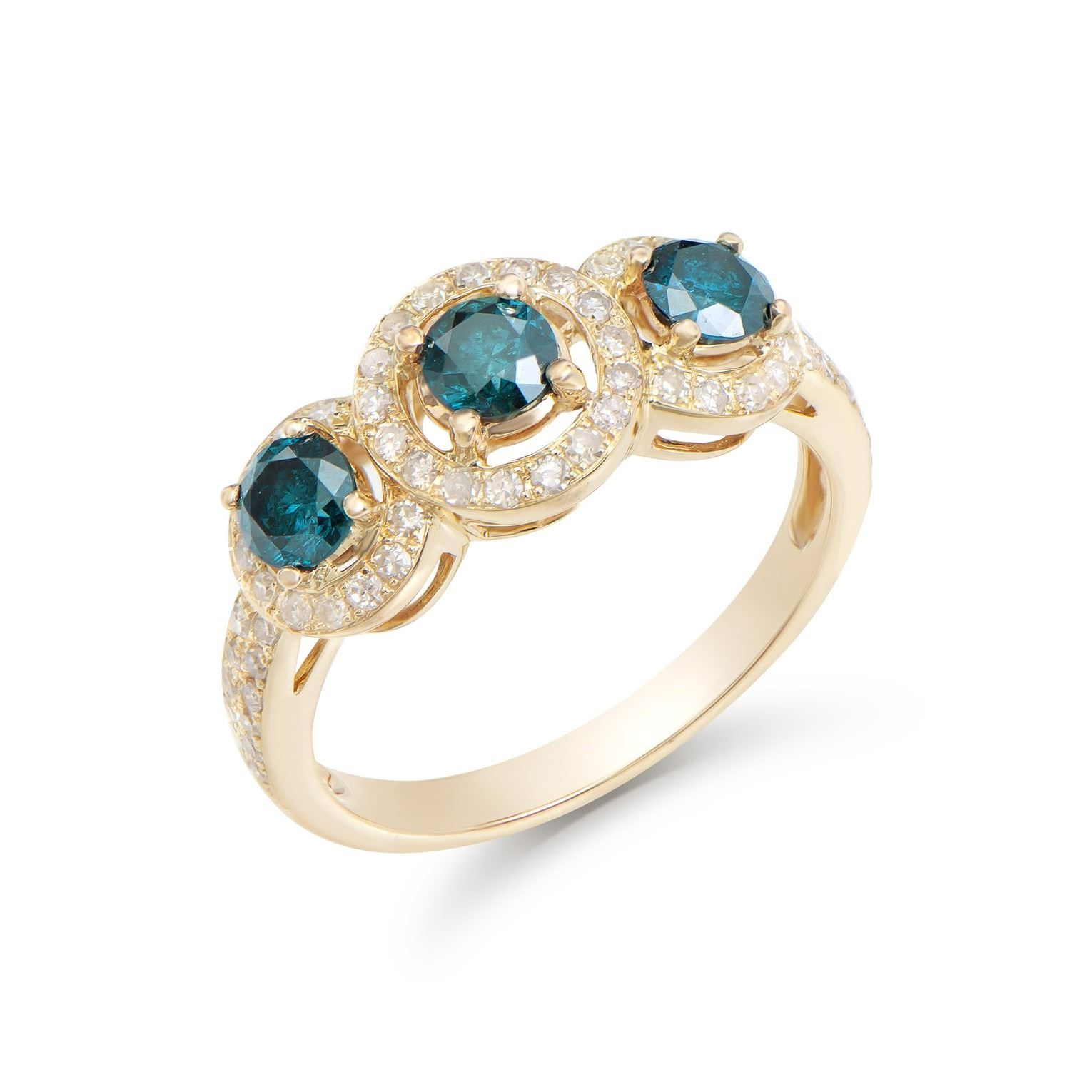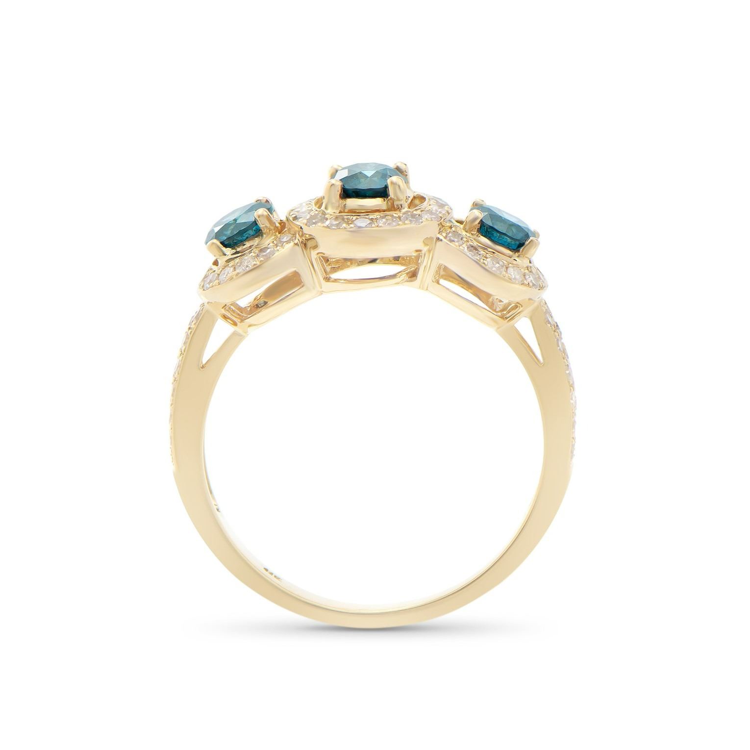 (3) round dark Blue Diamonds with a total weight of 0.85cts with a color of Dark Blue and clarity of I1-I2. (63) round Diamonds with a total weight of 0.42cts with a color of H-I and clarity of I1-I2. Total weight of this ring is 3.15 grams. Ring size is 7.5.