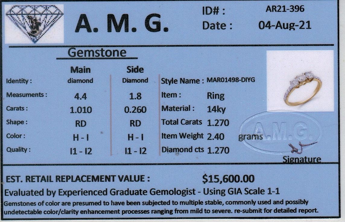 (3) round Diamonds with a total weight of 1.01cts with a color of H-I and clarity of I1-I2. (10) round Diamonds with a total weight of 0.26cts with a color of H-I and clarity of I1-I2. Total weight of this ring is 2.4 grams. Ring size is 7.5.