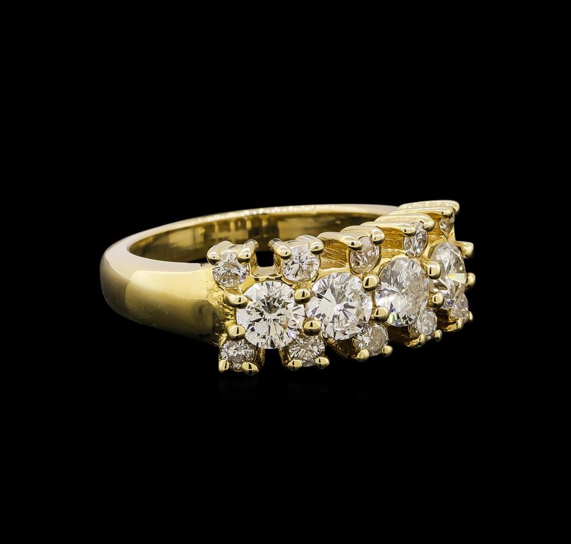 One electronically tested 14KT yellow gold ladies combination cast & assembled diamond ring with a bright polish finish. Identified with markings of "14K". Condition is new. Containing: Four prong set round brilliant cut diamonds, measuring 4.00 - 4.00 x 2.40mm (depth est.) approximate total weight of 4 Stones = 0.94ct. Clarity: I-1. Color: J, Cut is Good. Ten prong set round brilliant cut diamonds, measuring 2.10 - 2.10 x 1.26mm (depth est.) approximate total weight of 10 Stones = 0.34ct. Clarity: SI-1 to I-1. Color: J, Cut is Poor. All diamonds are graded in the mounting, unless otherwise stated. Total Weight of Diamonds 1.28ct. Total Weight of Ring 6.70 grams. GGL Appraised at $4,870.00.
