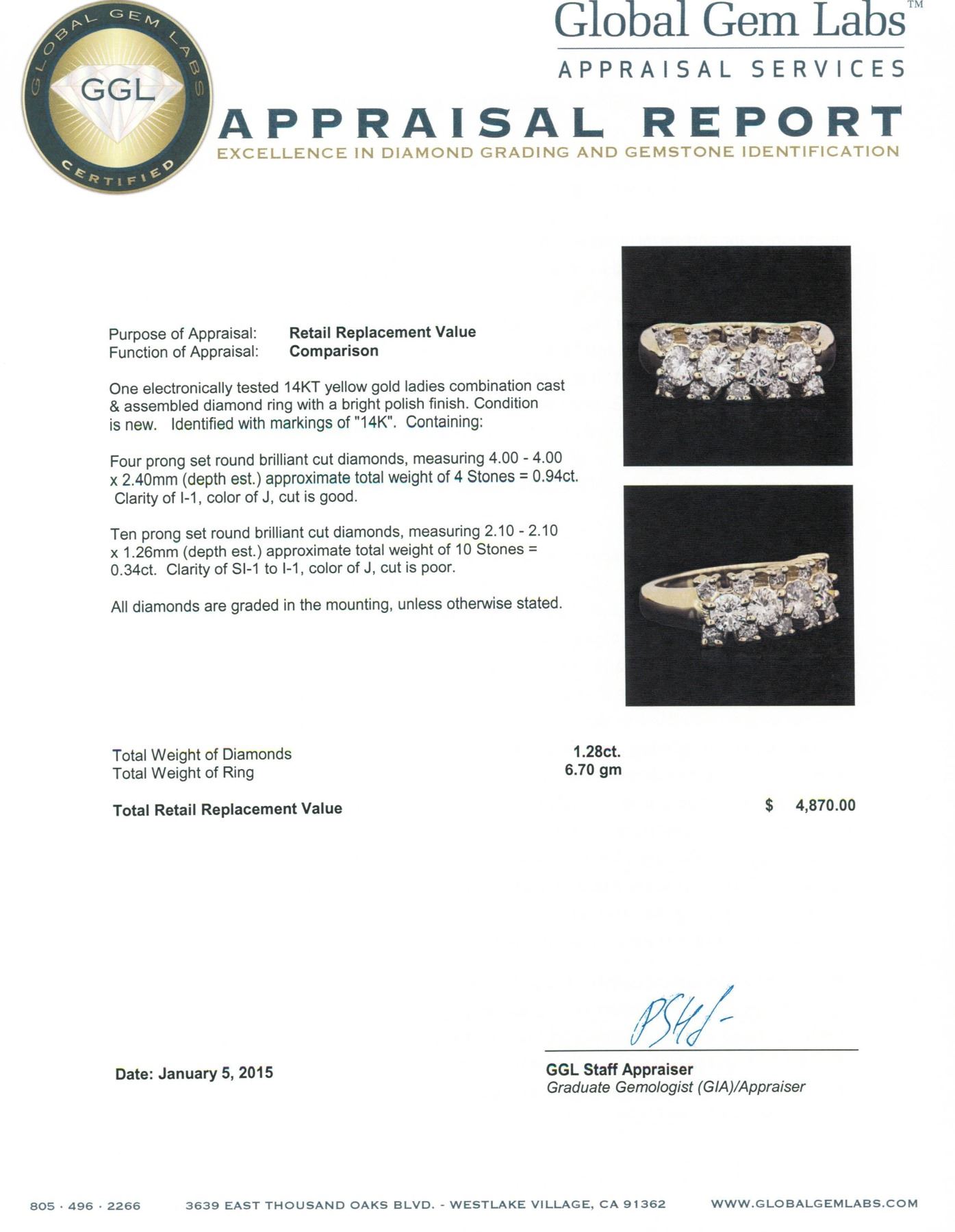 One electronically tested 14KT yellow gold ladies combination cast & assembled diamond ring with a bright polish finish. Identified with markings of "14K". Condition is new. Containing: Four prong set round brilliant cut diamonds, measuring 4.00 - 4.00 x 2.40mm (depth est.) approximate total weight of 4 Stones = 0.94ct. Clarity: I-1. Color: J, Cut is Good. Ten prong set round brilliant cut diamonds, measuring 2.10 - 2.10 x 1.26mm (depth est.) approximate total weight of 10 Stones = 0.34ct. Clarity: SI-1 to I-1. Color: J, Cut is Poor. All diamonds are graded in the mounting, unless otherwise stated. Total Weight of Diamonds 1.28ct. Total Weight of Ring 6.70 grams. GGL Appraised.