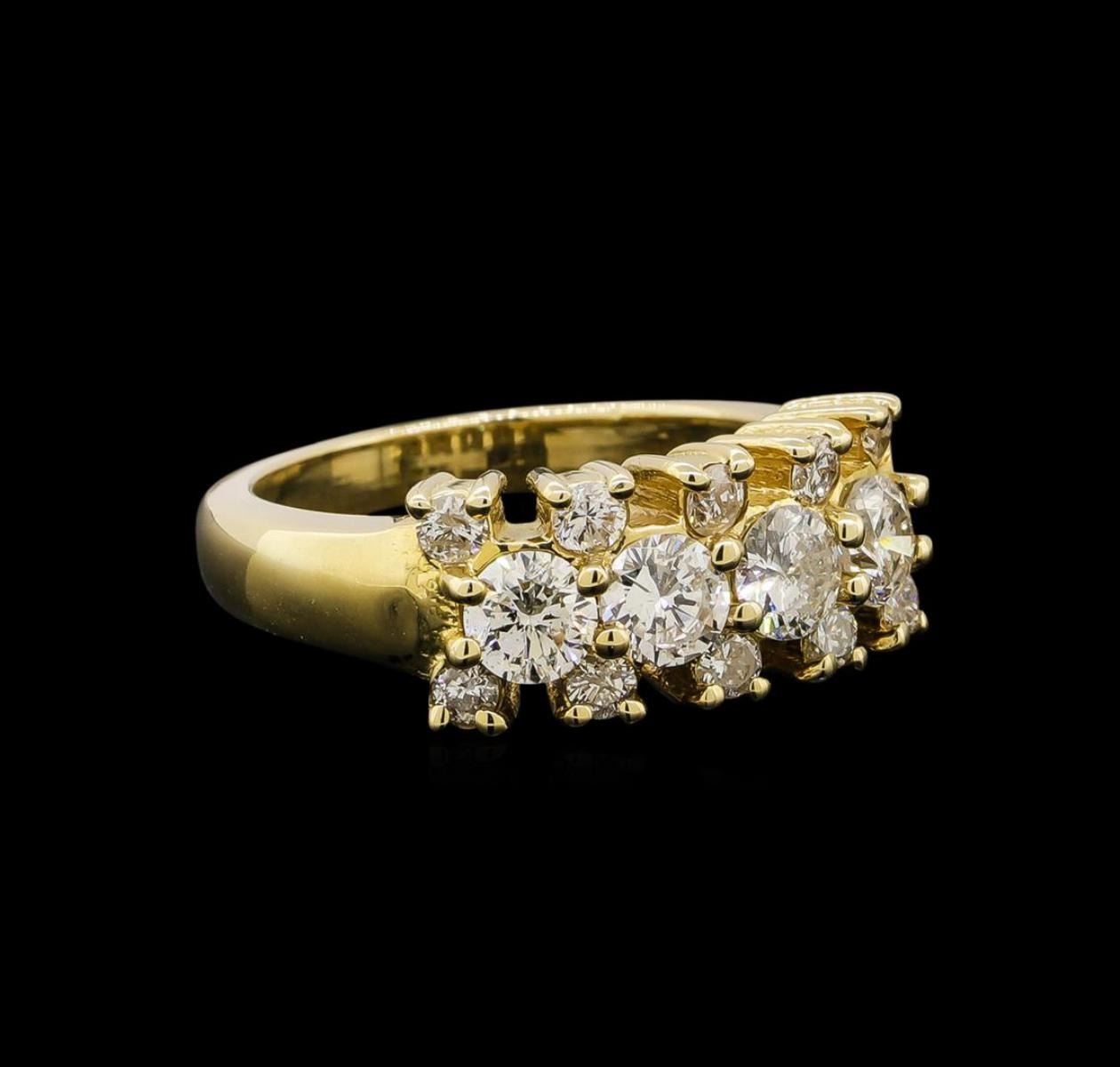 One electronically tested 14KT yellow gold ladies combination cast & assembled diamond ring with a bright polish finish. Identified with markings of "14K". Condition is new. Containing: Four prong set round brilliant cut diamonds, measuring 4.00 - 4.00 x 2.40mm (depth est.) approximate total weight of 4 Stones = 0.94ct. Clarity: I-1. Color: J, Cut is Good. Ten prong set round brilliant cut diamonds, measuring 2.10 - 2.10 x 1.26mm (depth est.) approximate total weight of 10 Stones = 0.34ct. Clarity: SI-1 to I-1. Color: J, Cut is Poor. All diamonds are graded in the mounting, unless otherwise stated. Total Weight of Diamonds 1.28ct. Total Weight of Ring 6.70 grams. GGL Appraised.