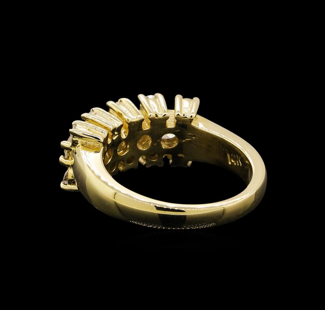 One electronically tested 14KT yellow gold ladies combination cast & assembled diamond ring with a bright polish finish. Identified with markings of "14K". Condition is new. Containing: Four prong set round brilliant cut diamonds, measuring 4.00 - 4.00 x 2.40mm (depth est.) approximate total weight of 4 Stones = 0.94ct. Clarity: I-1. Color: J, Cut is Good. Ten prong set round brilliant cut diamonds, measuring 2.10 - 2.10 x 1.26mm (depth est.) approximate total weight of 10 Stones = 0.34ct. Clarity: SI-1 to I-1. Color: J, Cut is Poor. All diamonds are graded in the mounting, unless otherwise stated. Total Weight of Diamonds 1.28ct. Total Weight of Ring 6.70 grams. GGL Appraised.