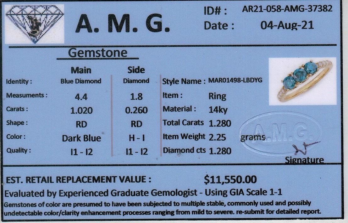 (3) round dark Blue Diamonds with a total weight of 1.02cts with a color of Dark Blue and clarity of I1-I2. (10) round Diamonds with a total weight of 0.26cts with a color of H-I and clarity of I1-I2. Total weight of this ring is 2.25 grams. Ring size is 7.5.