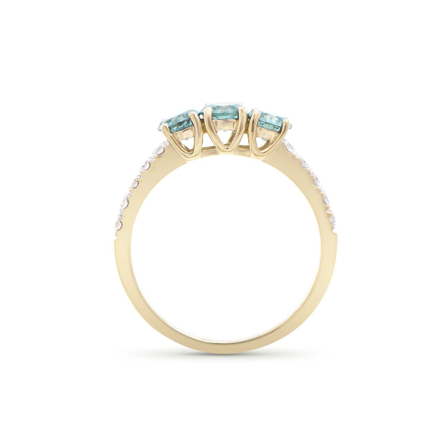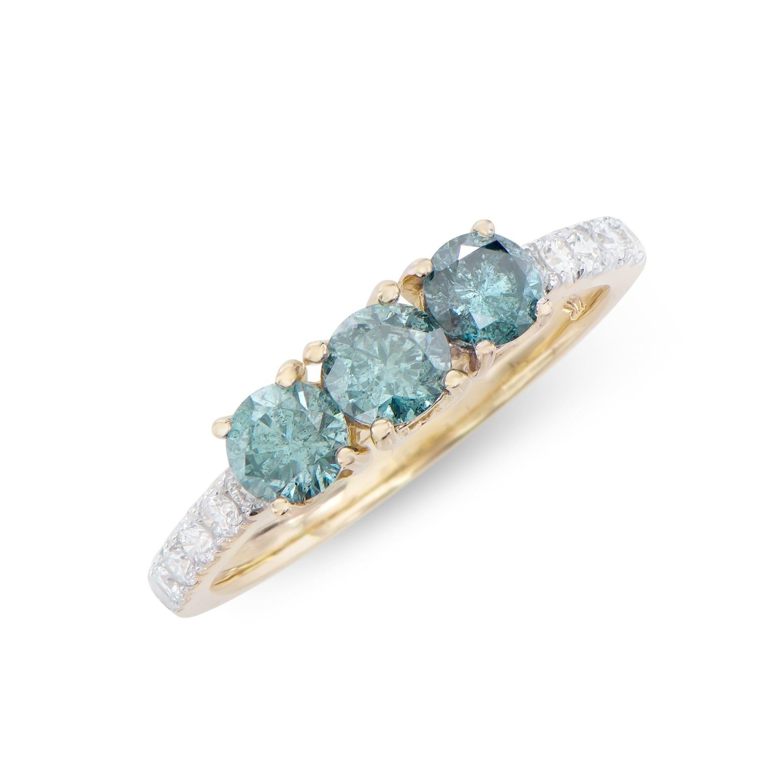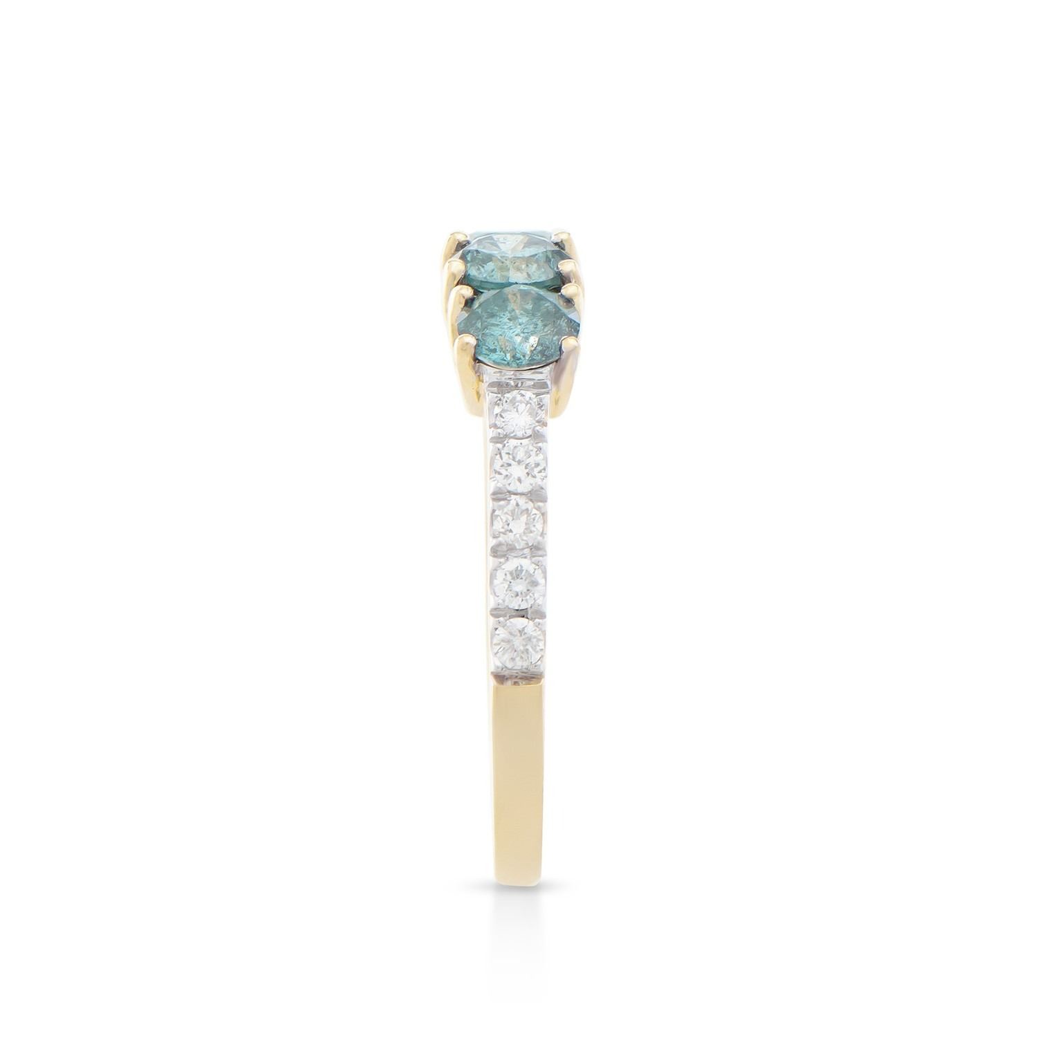 (3) round dark Blue Diamonds with a total weight of 1.02cts with a color of Dark Blue and clarity of I1-I2. (10) round Diamonds with a total weight of 0.26cts with a color of H-I and clarity of I1-I2. Total weight of this ring is 2.25 grams. Ring size is 7.5.