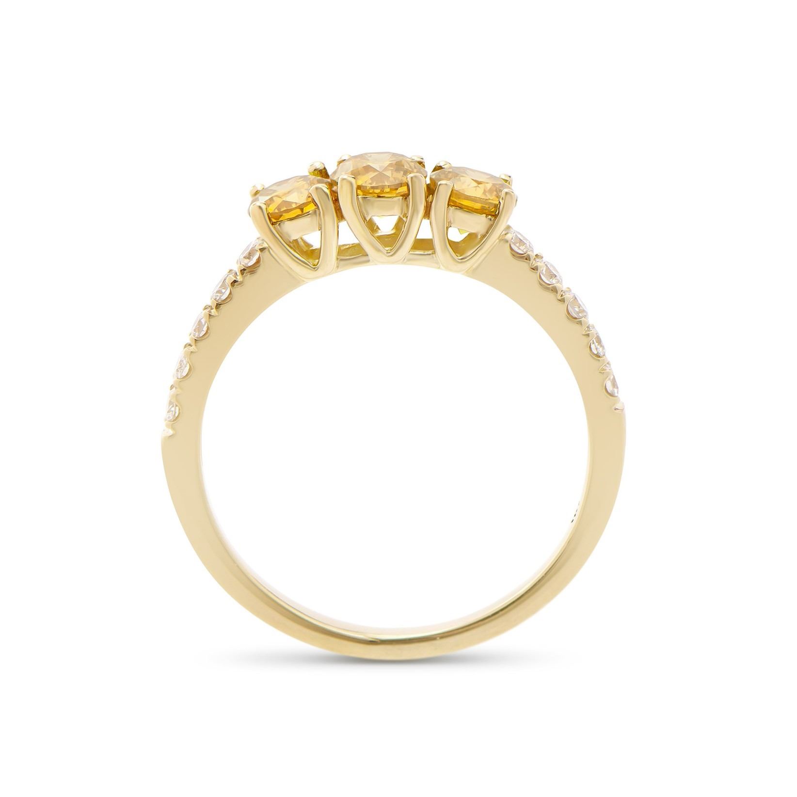 (3) round Yellow Diamonds with a total weight of 1.02cts with a color of Yellow and clarity of I1-I2. (10) round Diamonds with a total weight of 0.26cts with a color of H-I and clarity of I1-I2. Total weight of this ring is 2.25 grams. Ring size is 7.5.
