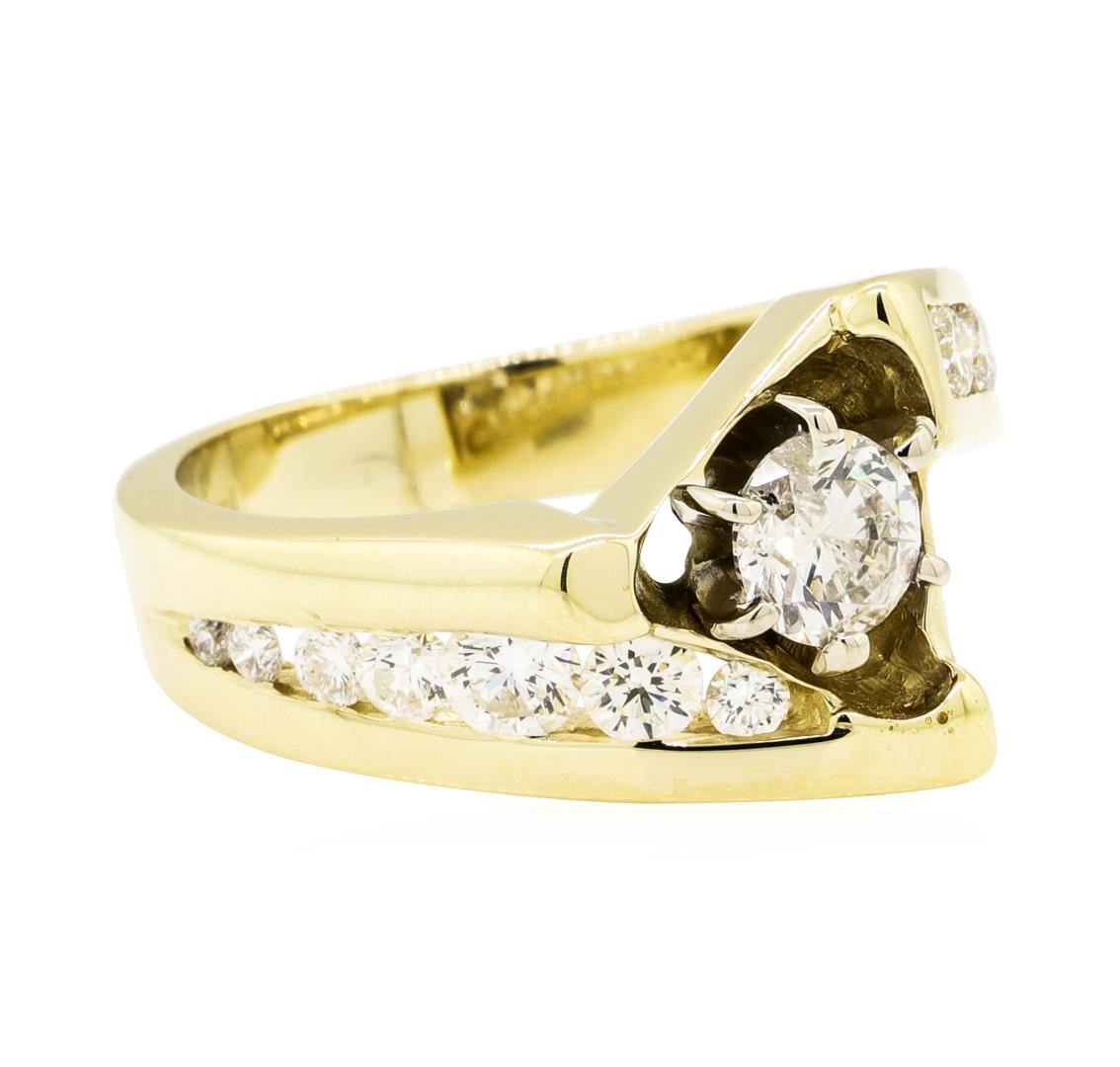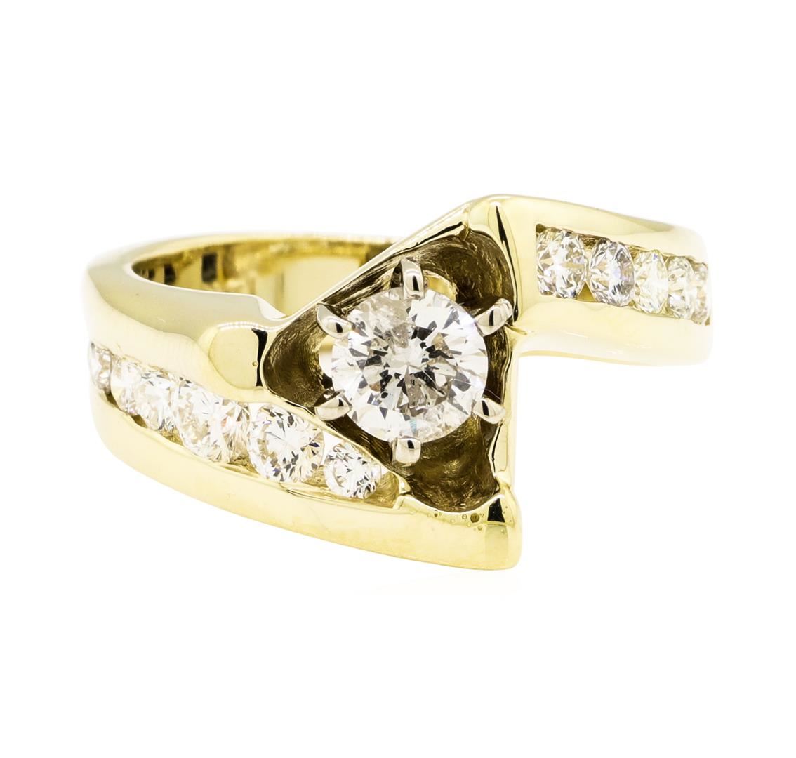 One electronically tested 14KT yellow gold lady's cast fashion ring with a bypass shank with a bright polish finish. The featured lady's ring has a shank measuring 3.85 millimeters wide. Identified with markings of '14K'. Condition is new, good workmanship. Containing: One prong set round brilliant cut diamond, measuring 5.25 - 5.20 x 3.24mm (depth est.) approximate weight of 0.57ct. Graded in the setting. Color I - J Clarity I-1 Cut Good Twelve channel set round brilliant cut diamonds, measuring 3.60 - 1.60 x 1.61mm (depth est.) approximate total weight of 12 Stones = 0.72ct. Graded in the setting. Color H - I Clarity VS-2 to SI-1 Cut Good. Total Weight of Diamonds 1.29ct.. Total Weight of Ring 7.80gm. GAS Appraised.