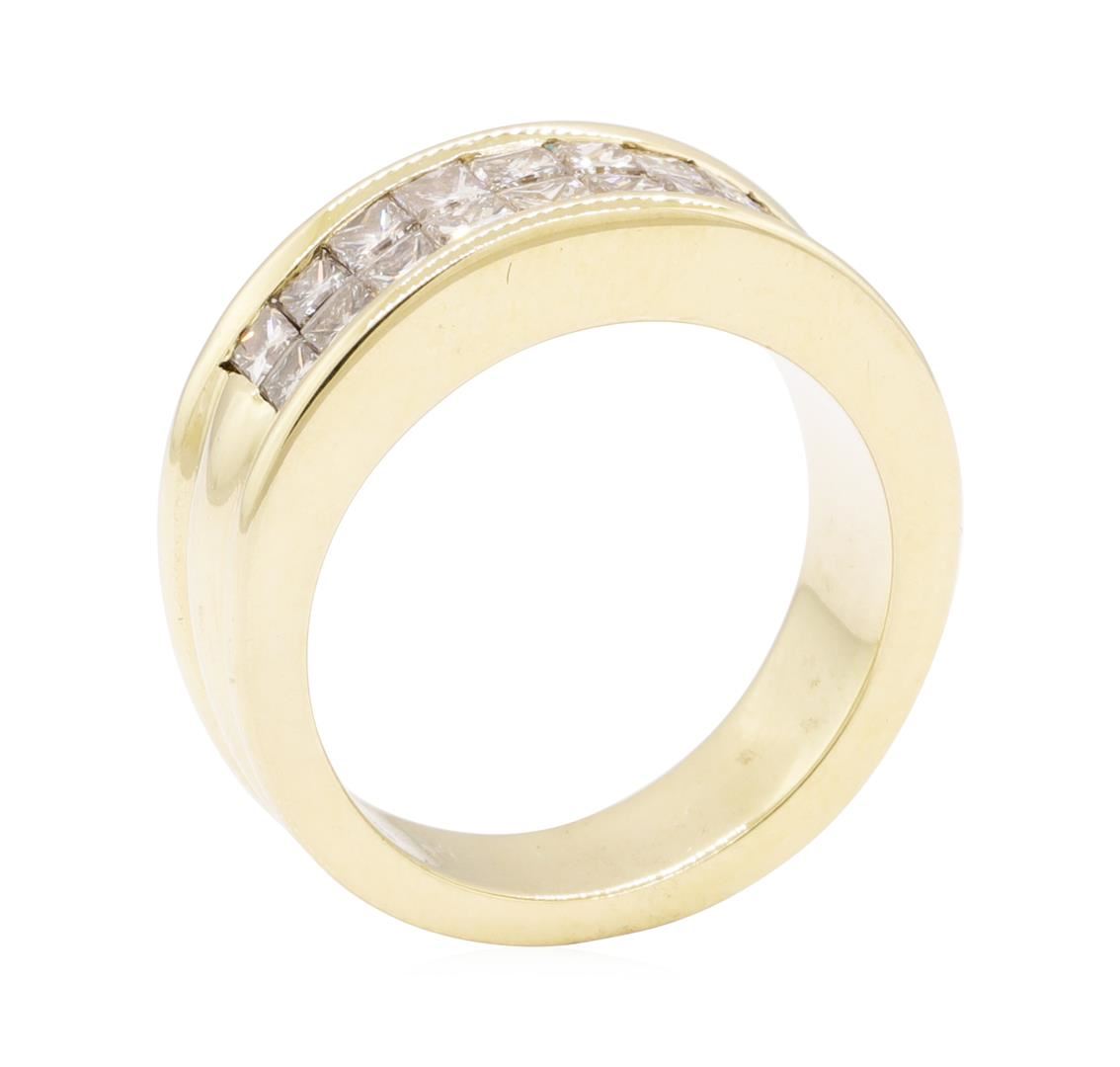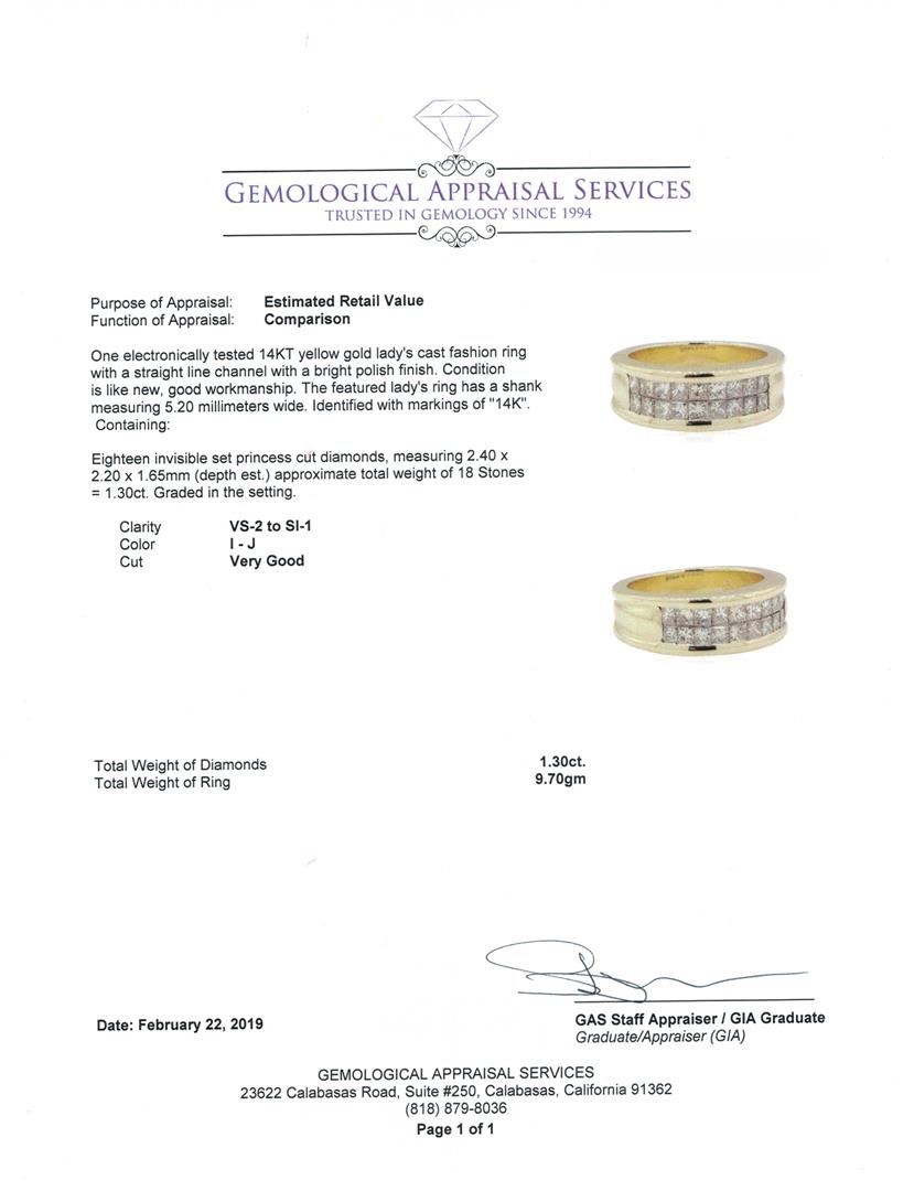 One electronically tested 14KT yellow gold lady's cast fashion ring with a straight line channel with a bright polish finish. The featured lady's ring has a shank measuring 5.20 millimeters wide. Identified with markings of '14K'. Condition is like new, good workmanship. Containing: Eighteen invisible set princess cut diamonds, measuring 2.40 x 2.20 x 1.65mm (depth est.) approximate total weight of 18 Stones = 1.30ct. Graded in the setting. Color I - J, Clarity VS-2 to SI-1, Cut Very Good. Total Weight of Diamonds 1.30ct. Total Weight of Ring 9.70gm. GAS Appraised.