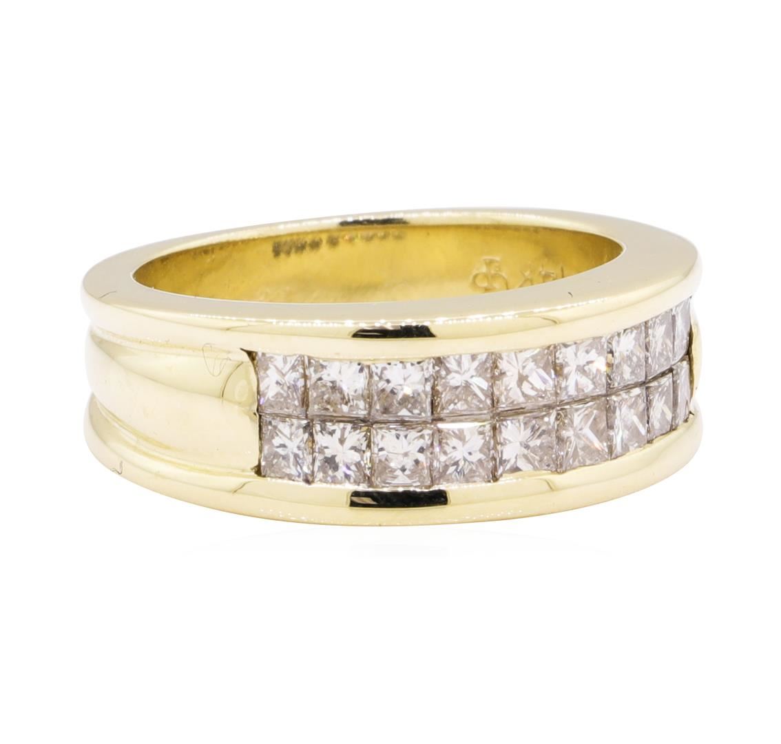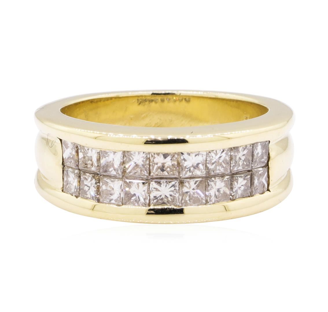 One electronically tested 14KT yellow gold lady's cast fashion ring with a straight line channel with a bright polish finish. The featured lady's ring has a shank measuring 5.20 millimeters wide. Identified with markings of '14K'. Condition is like new, good workmanship. Containing: Eighteen invisible set princess cut diamonds, measuring 2.40 x 2.20 x 1.65mm (depth est.) approximate total weight of 18 Stones = 1.30ct. Graded in the setting. Color I - J, Clarity VS-2 to SI-1, Cut Very Good. Total Weight of Diamonds 1.30ct. Total Weight of Ring 9.70gm. GAS Appraised.