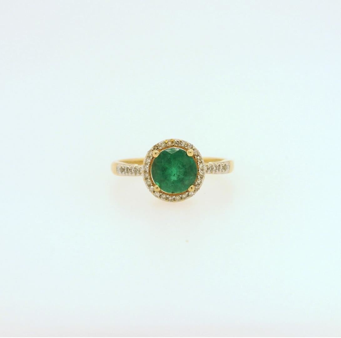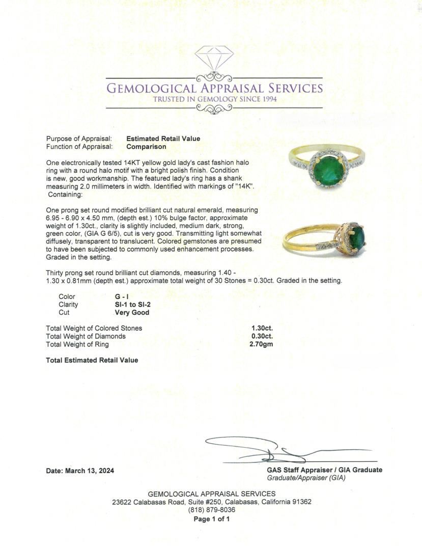 One electronically tested 14KT yellow gold lady's cast fashion halo ring with a round halo motif with a bright polish finish. Condition is new, good workmanship. The featured lady's ring has a shank measuring 2.0 millimeters in width. Identified with markings of "14K". Containing: One prong set round modified brilliant cut natural emerald, measuring 6.95 - 6.90 x 4.50mm, (Depth es.) 10% bulge factor, approximate weight of 1.3ct., clarity is slightly included, medium dark, strong, green color, (GIA G 6/5), cut is very good. Transmitting light somewhat diffusely, transparent to translucent. Colored gemstones are presumed to have been subjected to commonly used enhancement processes. Graded in the setting. Thirty prong set round brilliant cut diamonds, measuring 1.40 - 1.30 x 0.81mm (depth est.) approximate total weight of 30stones= 0.30ct. Graded in the setting. Color: G-I. Clarity: SI-1 to SI-2. Cut: Very Good. Total weight of colored stones: 1.30ct. Total weight of diamonds: 0.30ct. Total weight of ring: 2.70gm. Appraised by Gemological Appraisal Services.
