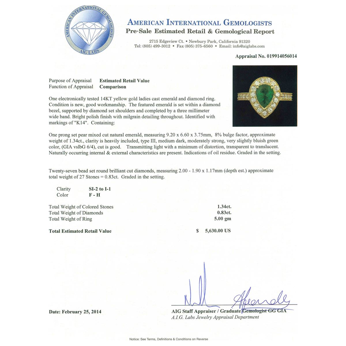 One electronically tested 14KT yellow gold ladies cast emerald and diamond ring. Condition is new, good workmanship. The featured emerald is set within a diamond bezel, supported by diamond set shoulders and completed by a three millimeter wide band. Bright polish finish with milgrain detailing throughout. Identified with markings of "K14". Containing: One prong set pear mixed cut natural emerald, measuring 9.20 x 6.60 x 3.75mm, 8% bulge factor, approximate weight of 1.34ct, clarity is heavily included, type III, medium dark, moderately strong, very slightly bluish green color, (GIA vslbG 6/4), cut is good. Transmitting light with a minimum of distortion, transparent to translucent. Naturally occurring internal & external characteristics are present. Indications of oil residue. Graded in the setting. Twenty-Seven bead set round brilliant cut diamonds, measuring 2.00 - 1.90 x 1.17mm (depth est.) approximate total weight of 27 Stones = 0.83ct. Graded in the setting. Clarity SI-2 to I-1 Color F - H Total Weight of Colored Stones 1.34ct. Total Weight of Diamonds 0.83ct. Total Weight of Ring 5.00 grams. AIG Appraised at $5,630.00.