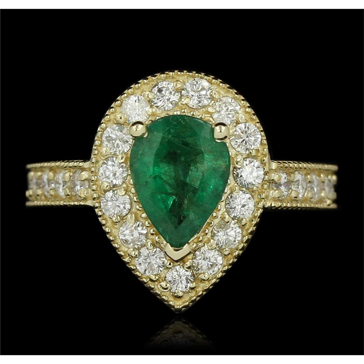 One electronically tested 14KT yellow gold ladies cast emerald and diamond ring. Condition is new, good workmanship. The featured emerald is set within a diamond bezel, supported by diamond set shoulders and completed by a three millimeter wide band. Bright polish finish with milgrain detailing throughout. Identified with markings of "K14". Containing: One prong set pear mixed cut natural emerald, measuring 9.20 x 6.60 x 3.75mm, 8% bulge factor, approximate weight of 1.34ct, clarity is heavily included, type III, medium dark, moderately strong, very slightly bluish green color, (GIA vslbG 6/4), cut is good. Transmitting light with a minimum of distortion, transparent to translucent. Naturally occurring internal & external characteristics are present. Indications of oil residue. Graded in the setting. Twenty-Seven bead set round brilliant cut diamonds, measuring 2.00 - 1.90 x 1.17mm (depth est.) approximate total weight of 27 Stones = 0.83ct. Graded in the setting. Clarity SI-2 to I-1 Color F - H Total Weight of Colored Stones 1.34ct. Total Weight of Diamonds 0.83ct. Total Weight of Ring 5.00 grams. AIG Appraised at $5,630.00.