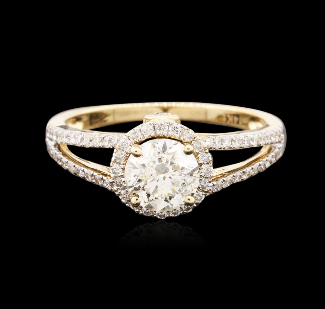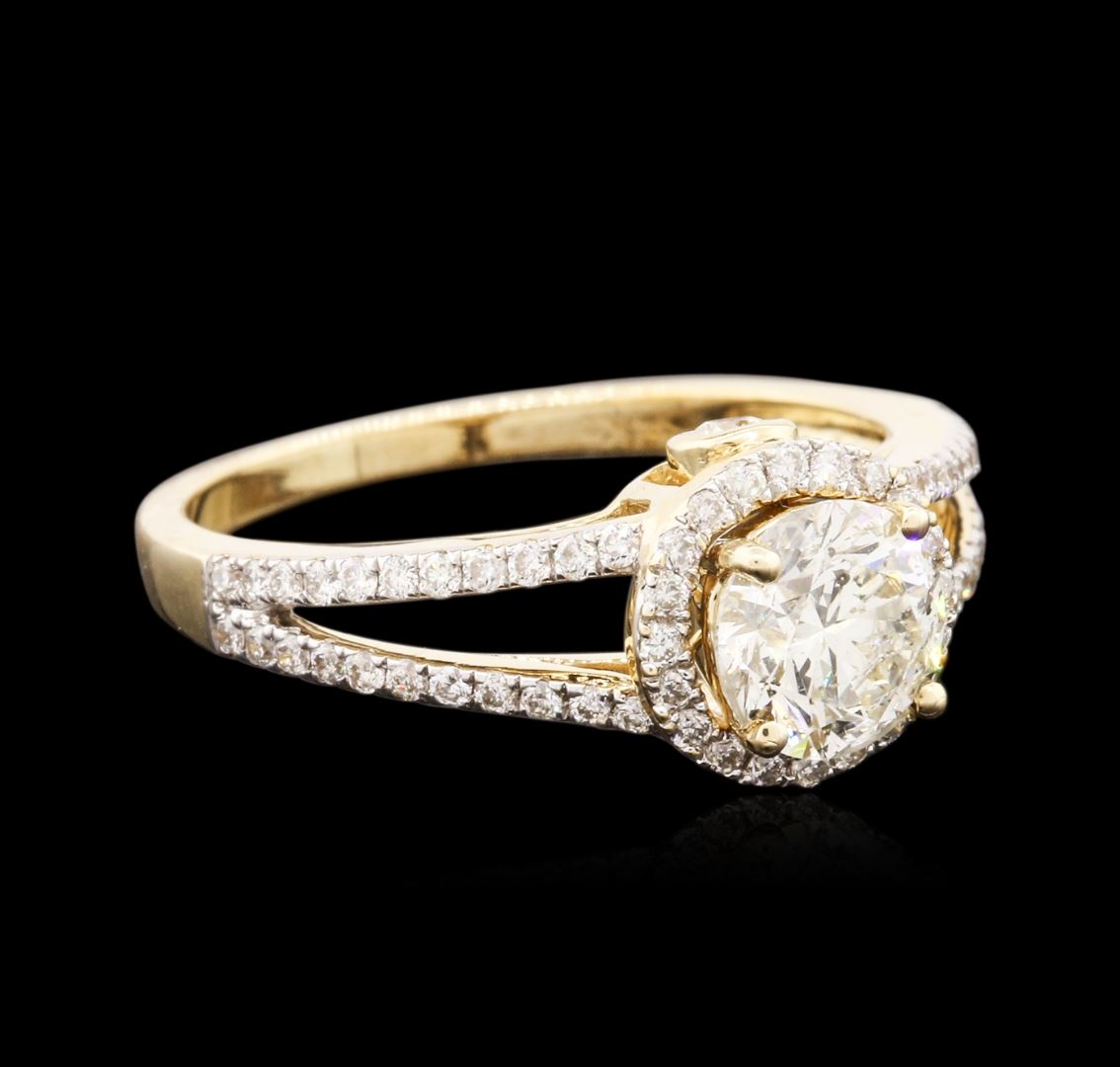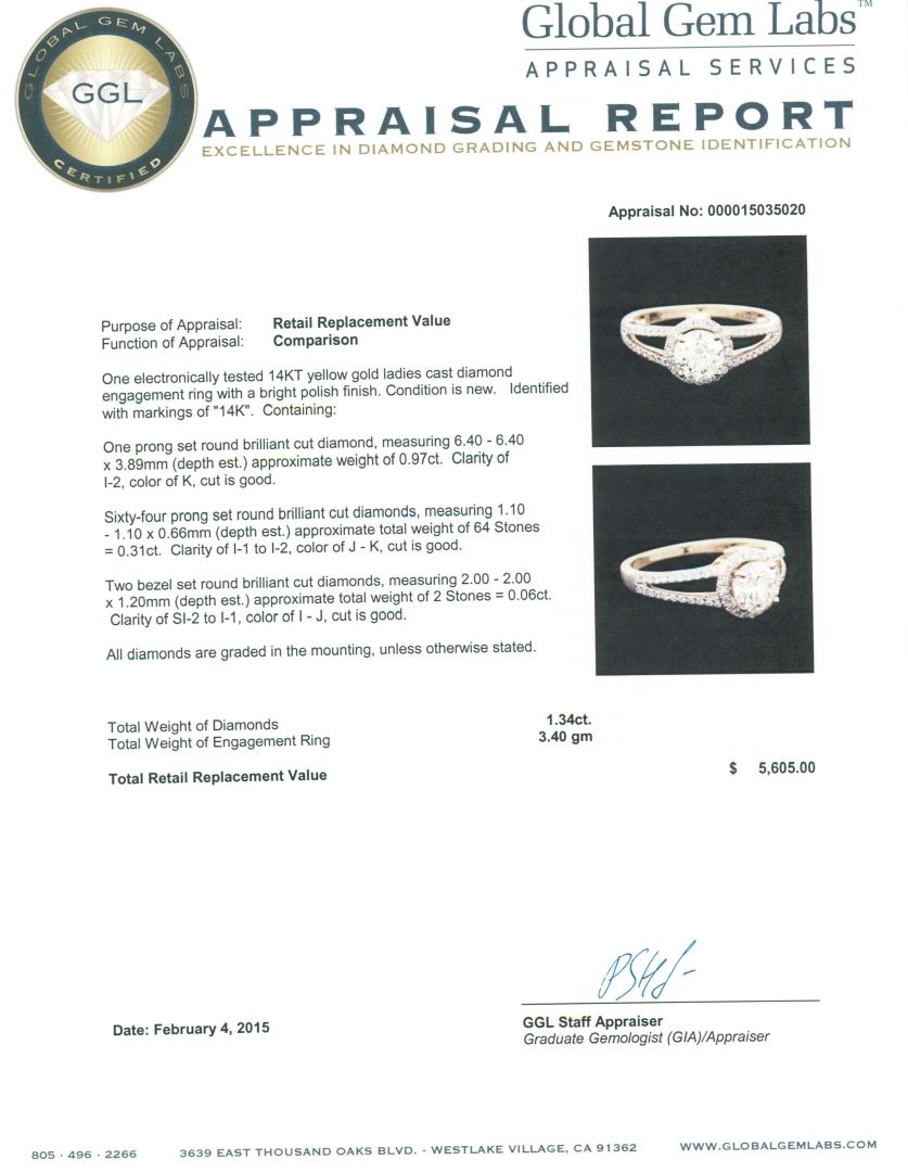 One electronically tested 14KT yellow gold ladies cast diamond engagement ring with a bright polish finish. Identified with markings of "14K". Condition is new. Containing: One prong set round brilliant cut diamond, measuring 6.40 - 6.40 x 3.89mm (depth est.) approximate weight of 0.97ct. Clarity: I-2. Color: K, Cut is Good. Sixty-Four prong set round brilliant cut diamonds, measuring 1.10 - 1.10 x 0.66mm (depth est.) approximate total weight of 64 Stones = 0.31ct. Clarity: I-1 to I-2. Color: J - K, Cut is Good. Two bezel set round brilliant cut diamonds, measuring 2.00 - 2.00 x 1.20mm (depth est.) approximate total weight of 2 Stones = 0.06ct. Clarity: SI-2 to I-1. Color: I - J, Cut is Good. All diamonds are graded in the mounting, unless otherwise stated. Total Weight of Diamonds 1.34ct. Total Weight of Engagement Ring 3.40 grams. GGL Appraised at $5,605.00.